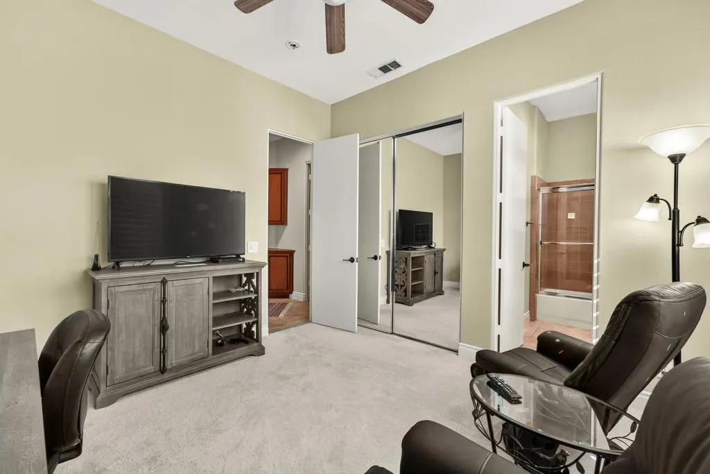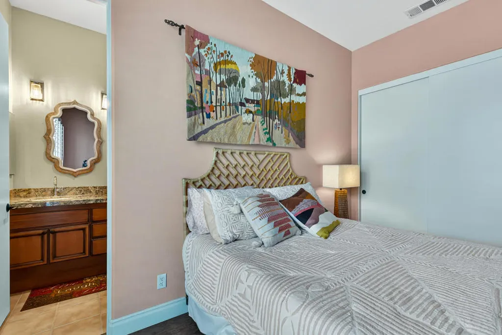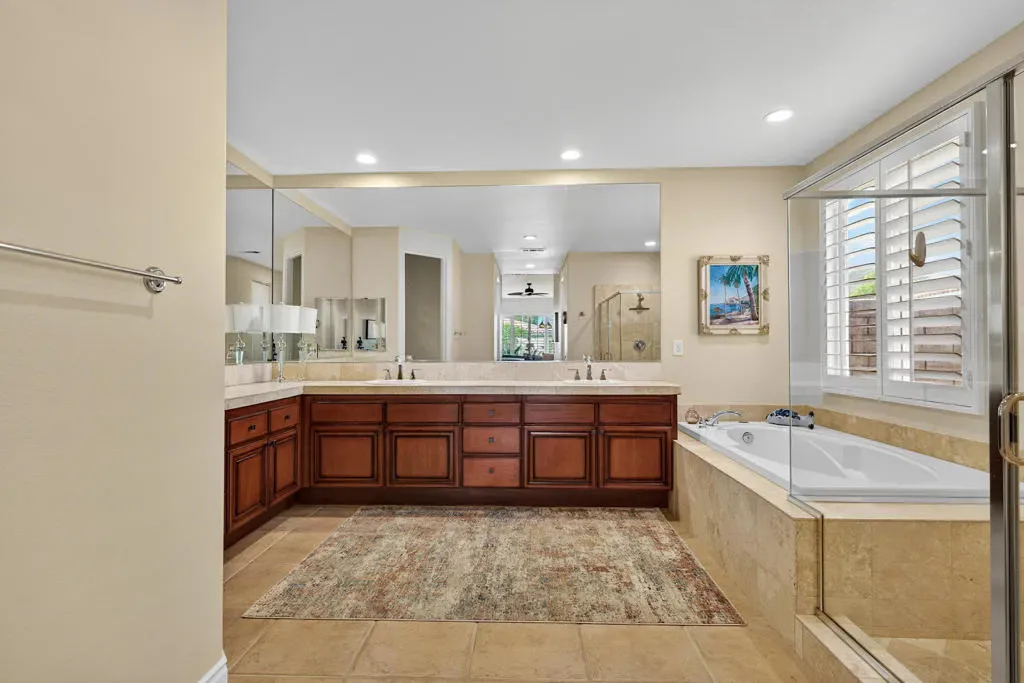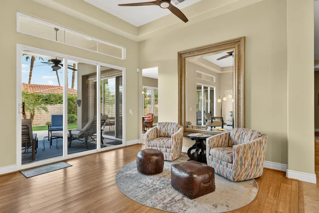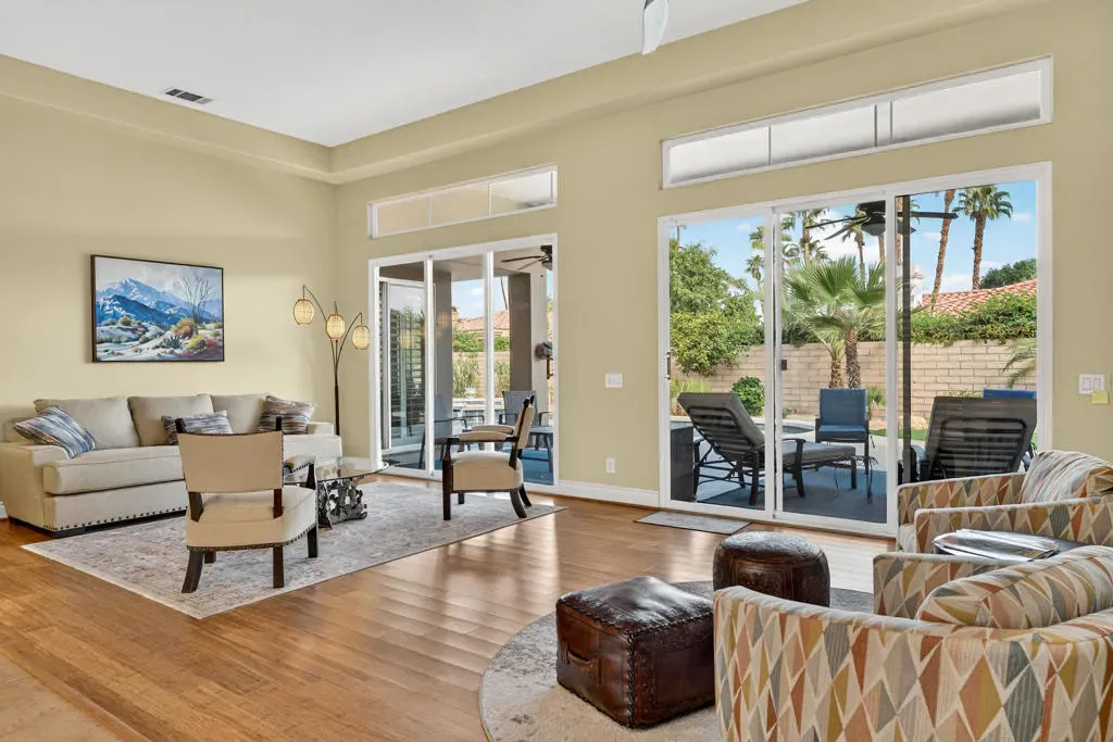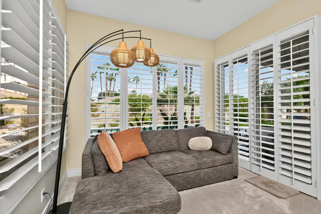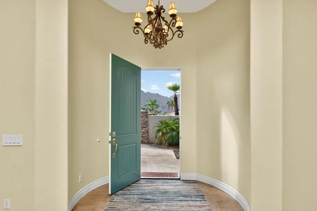Four bedrooms, all ensuite plus a powder room. 10′ & 12′ ceilings throughout. It features an ideal bedroom layout: the primary suite is on one side of the home, providing great separation from the three additional guest bedrooms on the other side, each with its own ensuite bathroom. A powder room is available for guests. All in nearly 3,000 square feet, many exterior updates, interior in A+ condition also with various updates, definitively in move-in condition. Views? YES, great southern mountain views from many positions both inside and out, starting with the charming courtyard at the entry, to the back where property sits higher than those on the pool side so there are expansive vistas and real privacy with Mt. San Jacinto as a backdrop. Sits at the top of a cul-de-sac in one of the few enclaves inside IWCC that has real live children and people under 60 (no offense to my compadres with whom I share this demographic). The yard space is great for kids and dogs and even those a bit older will find it relaxing, perfect for entertaining and most importantly, naps. Landscaping is especially low maintenance, all grass is turf, bushes and trees require infrequent trimming.Come see it, you will be glad that you did, time well spent.