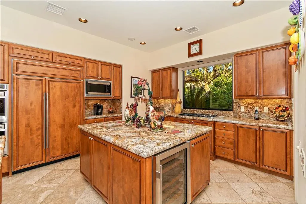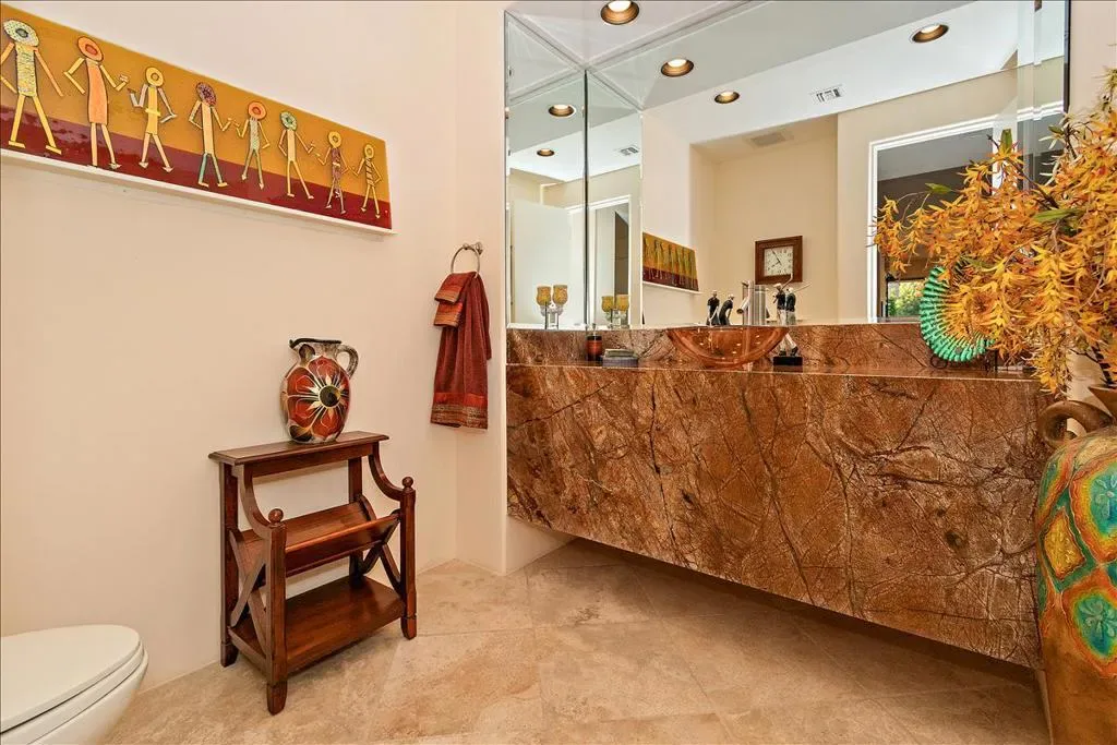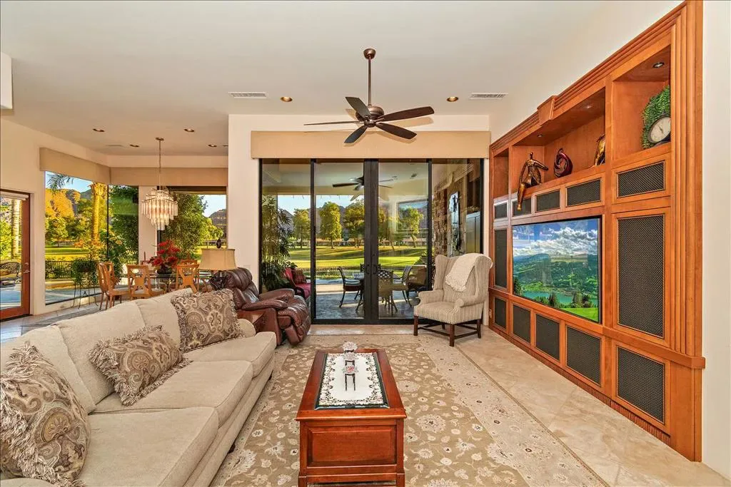 This is the home you have been waiting for! You will be amazed as you enter the gate of this picture perfect home in Indian Wells CC with 4 bedrooms (one bedroom is a detached casita), 4.5 baths, 3 car garage plus golf cart garage. The spectacular panoramic south mountain, lake, and golf course views are some of the best in the desert. This immaculately maintained gorgeous home has it all- great room plan with high ceilings and fireplace, chiseled travertine floors, slab granite in the kitchen with almost new appliances and oversized walk in pantry, dry bar, built in office or 4th bedroom, master suite with fireplace, double vanities, large tub, bidet, walk in shower, and supersized double closets. All the bedrooms have ensuite baths. The oversized detached courtyard casita has breakfast bar and mini refrigerator, fireplace, living area, ensuite bath, walk in closet, and private patio. The fabulous lushly landscaped outdoor area features a rose garden, fruit trees, large area for entertaining, artificial turf, misters, fire pit, built in BBQ with stacked stone facade, and bar, covered patio area with stone pillars and wall with fireplace, misters, large infinity pool and spa, coated concrete throughout the outdoor area. The garage has a split AC, cabinets, and epoxy floors. There many more upgrades that are too numerous to name. There is no HOA fee though there is manned gate. Please come and view this unbelievably beautiful home and see for yourself! You can enjoy paradise with a breathtaking view in a prime location every day.