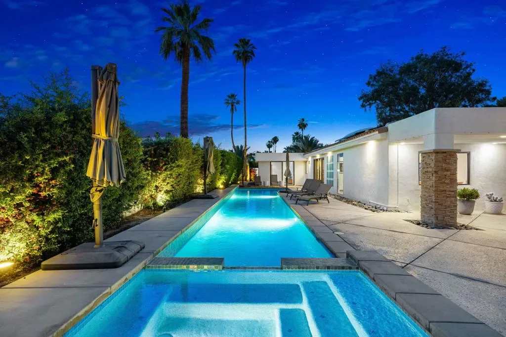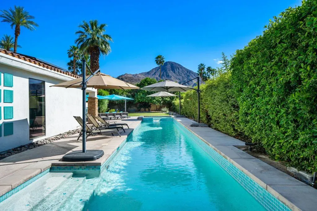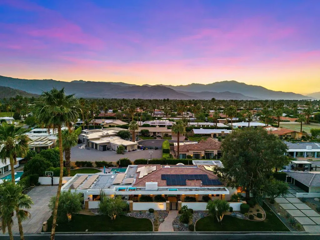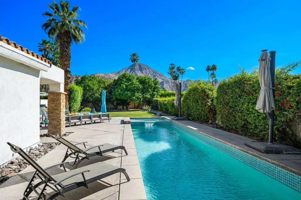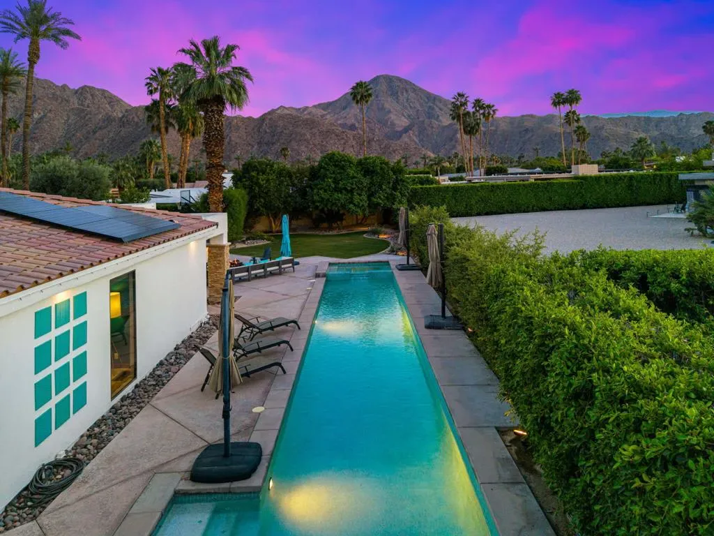 Indian Wells Luxury on .43 Acres | 84 Solar Panels | Lap Pool + Eisenhower Views. Desert modernism doesn’t get more authentic than this. Conceived by a celebrated local designer, Vicki McDermott in 1978, this single-story Indian Wells estate carries the architectural DNA of the Palm Springs design tradition. Tasteful contemporary updates make it feel completely at home in 2026. Timeless character, gracious proportions, and a one-of-a-kind provenance that simply cannot be replicated. At 5,323 square feet on nearly a half acre, this is the largest home and lot on the street. A genuinely custom offering at a scale that is increasingly rare in Indian Wells. The soaring great room, with ceilings over 22 feet high, two statement fireplaces, travertine floors, exposed beams, and solid alder wood doors and trim throughout deliver architectural character that no newer construction can touch. Five bedrooms offer flexible configurations, a primary suite and junior suite each with private en-suite baths, two additional bedrooms sharing a Jack-and-Jill bath, a dedicated guest bath off the playroom, and a private walled entry courtyard with a tranquil water feature. Multiple sets of sliding glass doors create seamless indoor-outdoor flow out to your private desert oasis with panoramic mountain views. Outside, the lap pool and spa anchor a true entertainer’s paradise. Built-in Alfresco professional grill, outdoor bar with sink, gas fire pit, full mister system, and smart exterior lighting throughout. The fully walled grounds are framed by mature privacy hedges, a towering Washingtonian palm, and a working citrus and fig orchard, tangelo, orange, and fig trees that produce generously in season. The 84-panel owned solar array means energy costs that are a fraction of comparable properties. A Tesla EV charger, epoxy-sealed garage floor, and full permitted natural gas system replacement round out an infrastructure story with zero deferred maintenance questions. No HOA. No gates. No monthly fees. Indian Wells prestige, walking distance to Eldorado Country Club, Indian Wells Country Club, and The Vintage Club, and minutes to the BNP Paribas Open and El Paseo. Whether you are here for tournament season or year-round desert living, this is complete California freedom on your own terms. Furnishings available separately. This home can be turn-key for the right buyer.
