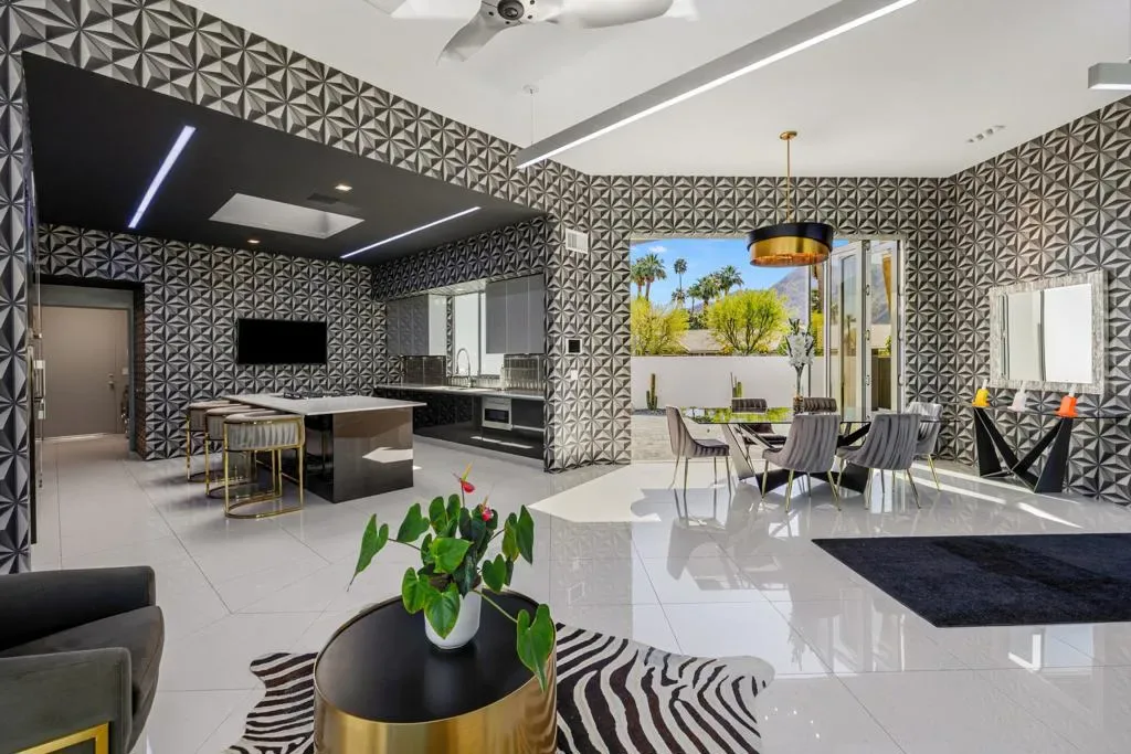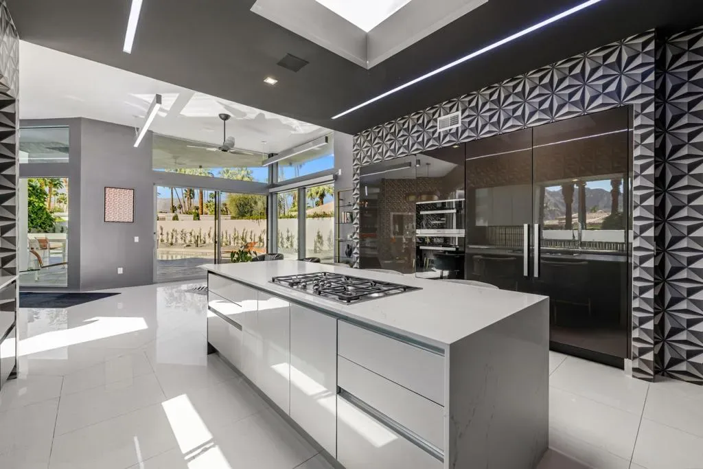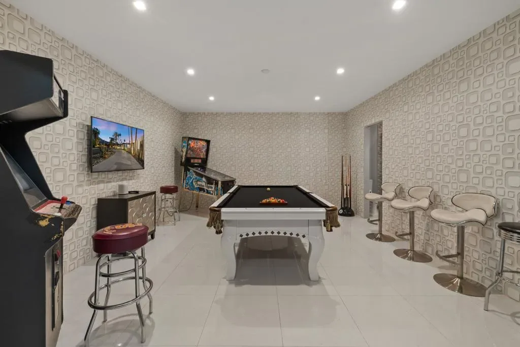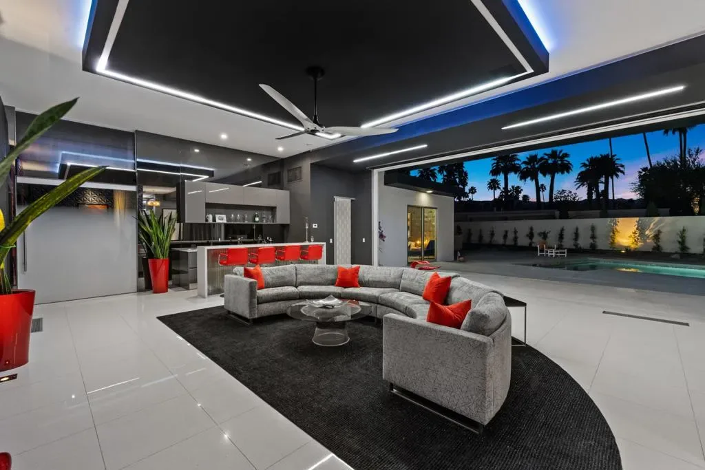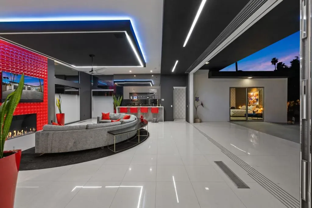 Situated in the heart of Indian Wells, this exceptional solar powered contemporary gated estate rests on a rare oversized double lot, offering grand living spaces, striking designer finishes, soaring ceilings, and seamless indoor-outdoor flow.Enter through your privately gated courtyard, where a dramatic 6-foot-wide glass pivot door makes a bold architectural statement. Inside, the living room leaves a lasting impression with sixteen-foot ceilings and a custom floor-to-ceiling red porcelain fireplace serving as a stunning focal point. A stylish wet bar and disappearing walls of glass open effortlessly to the expansive, low-maintenance backyard and massive pool — creating the ultimate environment for entertaining family and friends or peaceful relaxation.The adjacent dining area and sleek custom finish modern kitchen are bright, open, and highly functional, offering exceptionalm flow, and framed by walls of glass on both sides that flood the space with natural light while maintaining effortless flow.The luxurious primary suite serves as a private retreat, featuring spa like bath–steamshower–soaking tub, and a wall of glass with direct access to the pool and yard, plush carpeting, dual oversized custom closets, and a spa-inspired bath designed for relaxation.In addition, the home offers two beautifully appointed spacious designer-finished bedroom suites, four baths, a fully equipped media room with wet bar, and a game room thoughtfully designed for unforgettable game days, movie nights, or casual gatherings.For those seeking the ultimate Desert Luxury Lifestyle living, this rare double-lot contemporary estate residence delivers exceptional space, privacy, and the perfect balance of sophistication and relaxed desert living.