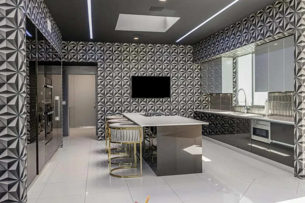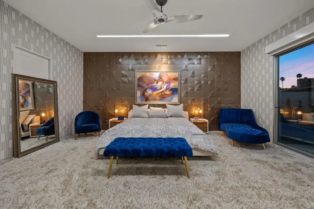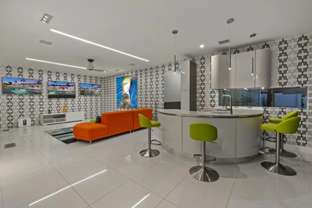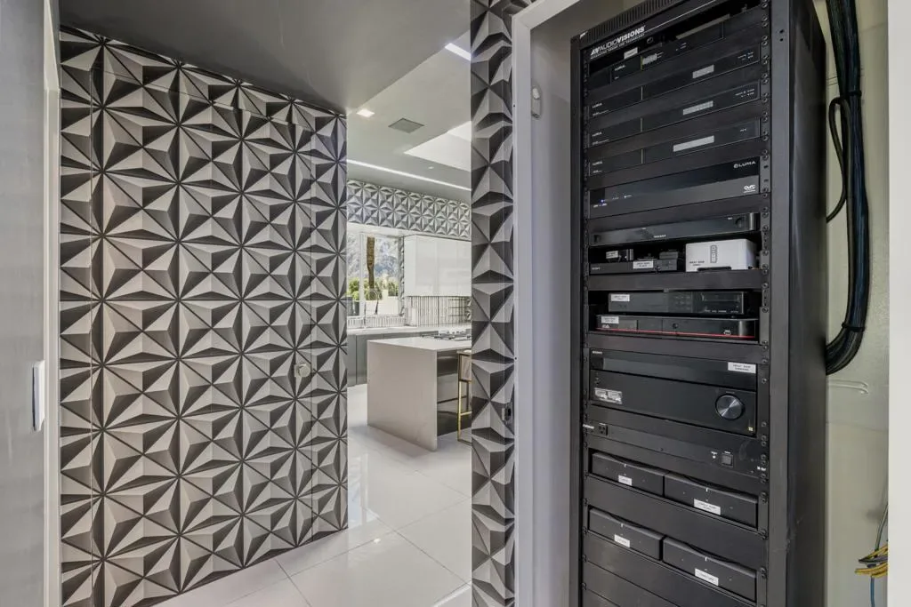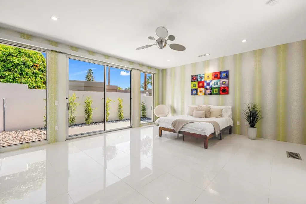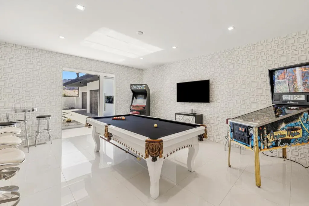 Situated in the heart of Indian Wells, this exceptional solar powered contemporary gated estate rests on a rare oversized double lot, offering grand living spaces, striking designer finishes, soaring ceilings, and seamless indoor-outdoor flow.Enter through your privately gated courtyard, where a dramatic 6-foot-wide glass pivot door makes a bold architectural statement. Inside, the living room leaves a lasting impression with sixteen-foot ceilings and a custom floor-to-ceiling red porcelain fireplace serving as a stunning focal point. A stylish wet bar and disappearing walls of glass open effortlessly to the expansive, low-maintenance backyard and massive pool — creating the ultimate environment for entertaining family and friends or peaceful relaxation.The adjacent dining area and sleek custom finish modern kitchen are bright, open, and highly functional, offering exceptionalm flow, and framed by walls of glass on both sides that flood the space with natural light while maintaining effortless flow.The luxurious primary suite serves as a private retreat, featuring spa like bath–steamshower–soaking tub, and a wall of glass with direct access to the pool and yard, plush carpeting, dual oversized custom closets, and a spa-inspired bath designed for relaxation.In addition, the home offers two beautifully appointed spacious designer-finished bedroom suites, four baths, a fully equipped media room with wet bar, and a game room thoughtfully designed for unforgettable game days, movie nights, or casual gatherings.For those seeking the ultimate Desert Luxury Lifestyle living, this rare double-lot contemporary estate residence delivers exceptional space, privacy, and the perfect balance of sophistication and relaxed desert living.