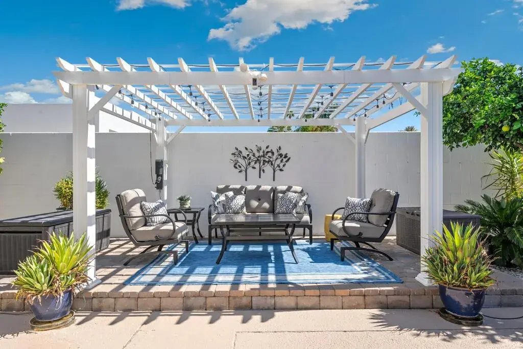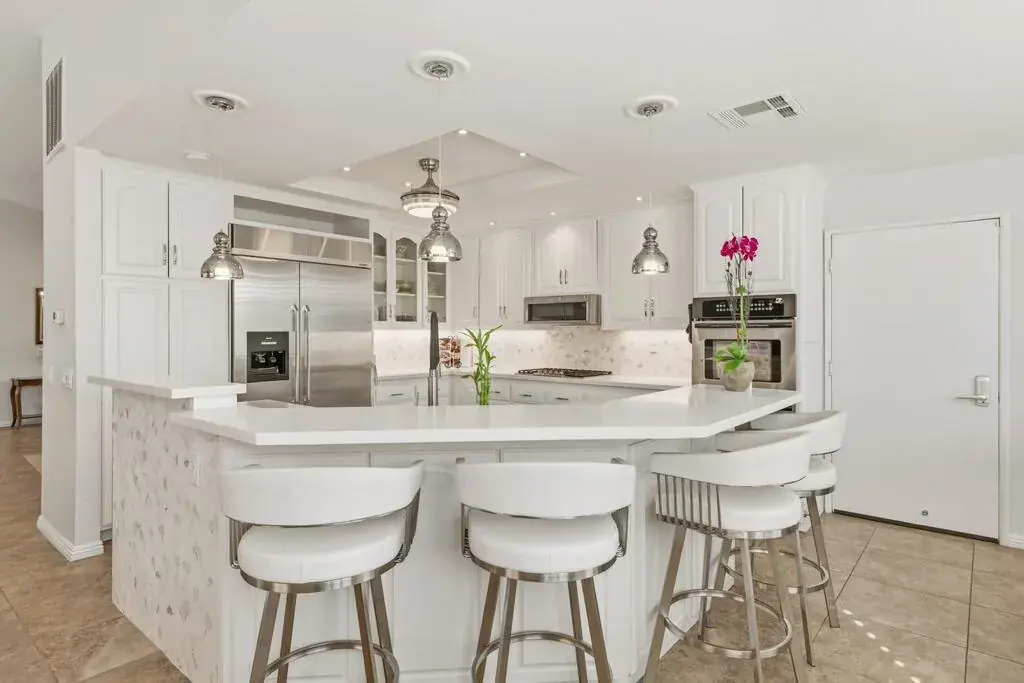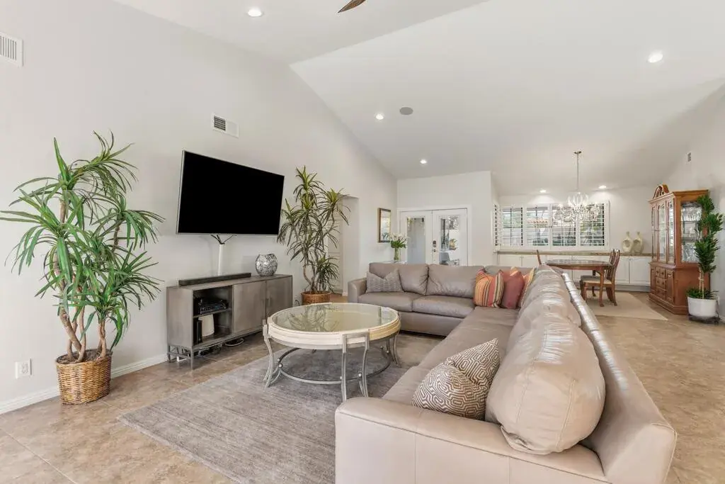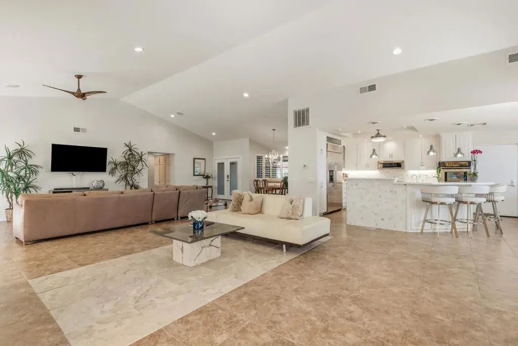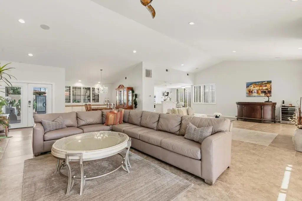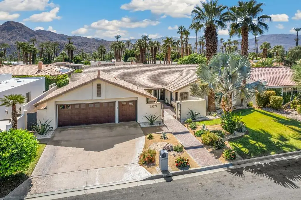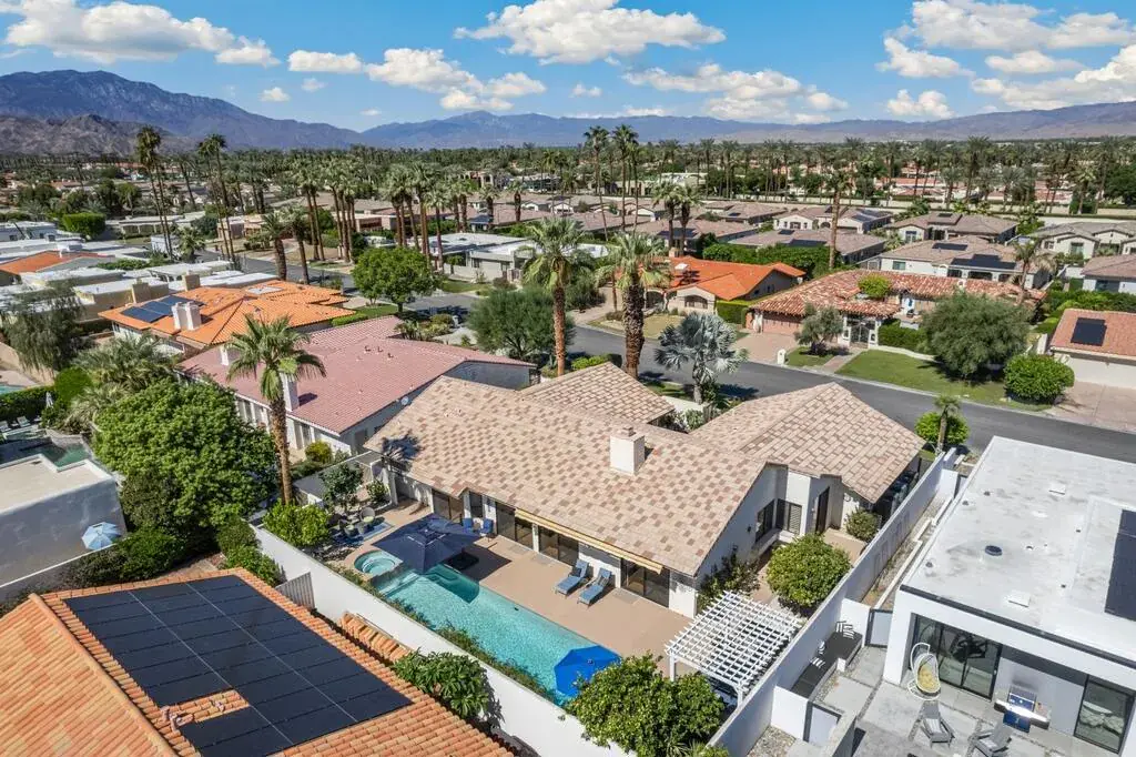 Priced Below New Construction – Fully Remodeled Pool Home with Mountain Views! Move-in ready Rancho Palmeras estate blending privacy, sophistication, and seamless indoor-outdoor living — just minutes to El Paseo and the Tennis Garden. Behind the privacy of a lush, gated courtyard, double entry doors set the tone for the elegance within. Step inside to a foyer and great room with soaring vaulted ceilings and a dramatic wall of glass sliders, instantly connecting the indoors with your private outdoor paradise. Designed with entertaining in mind, the expansive living area is anchored by a sleek fireplace-display unit with heaters/blowers on the sides, there are also built-in ceiling speakers – perfect for hosting! The chef’s kitchen is an inspiring space where culinary creativity comes alive. Outfitted with white quartz countertops, a striking marble backsplash, stainless steel appliances, and abundant cabinetry, it is as functional as it is beautiful. Whether preparing a quiet dinner or a holiday feast, the seamless flow between kitchen, dining, and living areas makes this home ideal for modern living. Beyond the sliding doors, your private outdoor oasis awaits. The sparkling pool and spa beckon for year-round enjoyment, complemented by motorized awnings that provide shade at the touch of a button. Relax beneath a solid patio cover, or wander through the garden dotted with fruit trees–orange infused with jasmine, lemon, Mexican lime, grapefruit, and fig. An outdoor shower adds a resort-style touch, offering the perfect refresh after a day in the desert sun. The primary suite is a serene retreat with its own access to the pool and spa. Inside, you’ll find dual closets and a spa-inspired bath featuring a deep soaking tub and a separate walk-in shower. One guest room has been converted into a stylish office with direct access to the courtyard, while additional bedrooms provide comfort and flexibility for family or guests. Every detail has been thoughtfully considered, from custom lighting and elegant tile flooring to plantation shutters and a whole-house water softener. Towering 8-foot privacy walls ensure seclusion, while breathtaking views of Eisenhower Mountain remind you daily of the natural beauty that defines Indian Wells living. Location is everything, and this home is ideally situated just 2.3 miles from El Paseo, the ”Rodeo Drive of the Desert,” where fine dining, art galleries, and luxury boutiq
