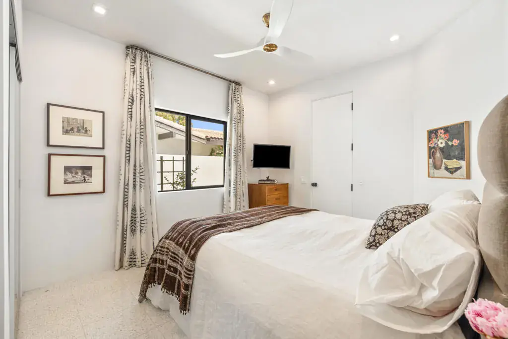 Welcome to this beautifully reimagined 4-bedroom, 3.5-bath home in the coveted Rancho Palmeras community of Indian Wells. Spanning 2,924 square feet, this residence effortlessly blends thoughtful design with luxurious comfort.From the moment you arrive, a striking 9-foot custom walnut door sets the tone for the refined interiors that await. Step inside to terrazzo tile floors and a classic atrium, filling the space with natural light and architectural character.The open-concept living area offers an inviting view through a full wall of glass doors, showcasing a crystal-clear swimming pool and spa–your own private desert retreat.At the heart of the home, the kitchen makes a bold impression with dramatic quartzite slab counters, custom floor-to-ceiling cabinetry, and a layout designed for both beauty and function. A bespoke cabinet provides a curated display for both vintage treasures and contemporary pieces. Every light fixture has been hand-selected to complement the home’s sophisticated aesthetic.The bathrooms are equally refined, featuring marble countertops, premium Waterworks fixtures, and a serene Japanese soaking tub, bringing spa-like tranquility to your daily routine. In the primary bedroom, awaken to soft morning light and peaceful peekaboo views of the surrounding mountains. Meticulously redesigned by Chris Barrett Design, this home is a rare opportunity to own a timeless, modern masterpiece in one of Indian Wells’ most desirable neighborhoods.
