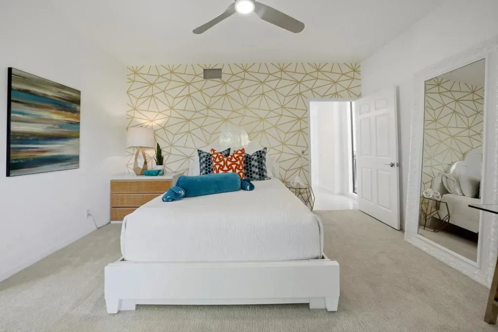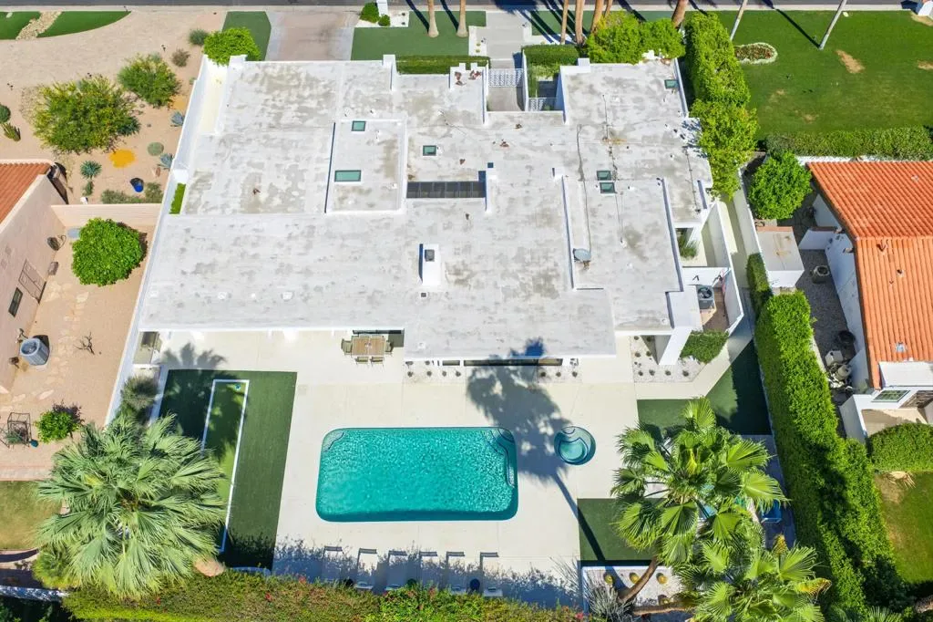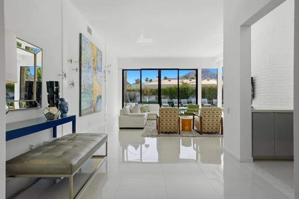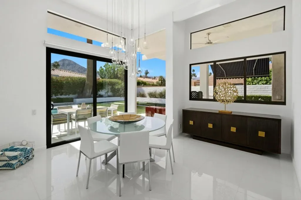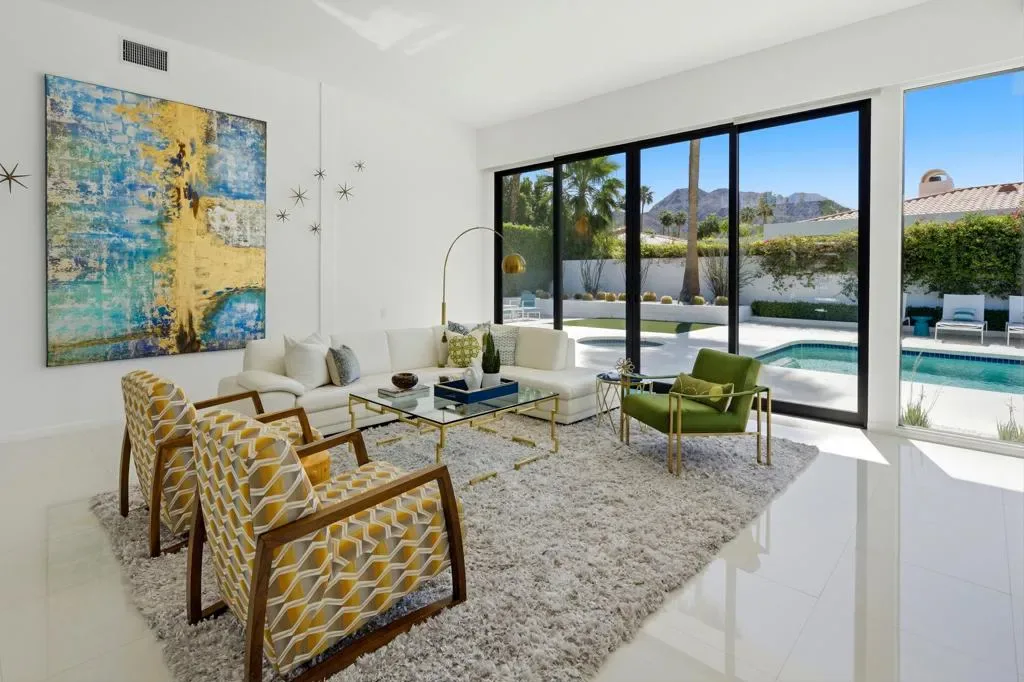 Step into iconic desert living with this stunning Mid-Century inspired remodel in coveted Indian Wells–where design, luxury, and lifestyle converge.Spanning approximately 3,100 square feet, this professionally designed showpiece offers three vibrant and luxurious ensuite bedrooms, each thoughtfully curated with bold character and elevated finishes. The open-concept floor plan seamlessly connects the living room, dining area, family room, and stylish bar–perfect for both entertaining and relaxed everyday living. A gourmet kitchen anchors the space, while the living room showcases dramatic floor-to-ceiling views that bring the outdoors in.The south-facing backyard is a true desert retreat, featuring a sparkling pool with all-day sun exposure and peek-a-boo views of the Santa Rosa Mountains. Enjoy resort-style amenities including a covered patio for shaded lounging, a built-in BBQ area, sleek glass fire feature, and a bocce ball court–all surrounded by beautifully reimagined landscaping.The spacious primary suite is a private sanctuary, complete with a spa-inspired bath featuring a soaking tub, oversized walk-in shower with penny tile accents, and an open-air outdoor shower for a true indoor-outdoor experience.Additional highlights include a two-car garage with a third golf cart bay and a designer furniture package included for a fully turnkey opportunity. A rare blend of style, comfort, and sophistication–this is desert living at its finest.