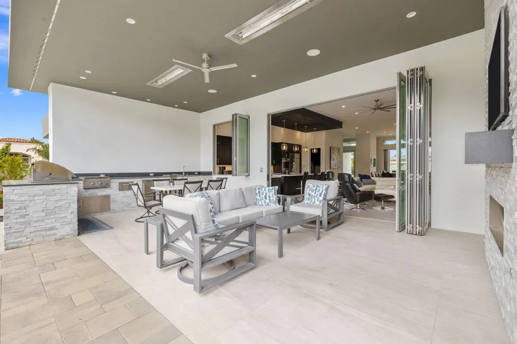 Welcome to your dream desert escape! Nestled on a coveted corner lot in prestigious Indian Wells, this custom-built 4-bedroom estate is the epitome of modern elegance and seamless indoor-outdoor living. Backing up to the base of the breathtaking Santa Rosa Mountains, this home offers unparalleled panoramic views and ultimate privacy. Step inside to soaring 12′ ceilings, an open-concept floor plan, and high-end finishes throughout with large format tile throughout the house, courtyard and rear patio, along with a custom accordion sliding door and window off the great room create a stunning transition to the resort-style backyard, where you’ll find a custom pavered patio, pool, spa, firepit, and a fully equipped outdoor kitchen–all designed for effortless entertaining. Stay comfortable year-round with a misting system and patio heaters, while the sleek stacked stone indoor and outdoor fireplaces add ambiance. The chef’s kitchen is a masterpiece, featuring a massive quartz waterfall island, dark toned shaker cabinetry, professional stainsteel steel Dacor appliances, custom light fixture and a walk-in butlers pantry. The adjacent custom wet bar offers the same high end finishes, and whole-home surround sound system elevate your hosting experience. Each of the 4 en-suite bathrooms as well as the powder bath and full outdoor bathroom offer matching quartz countertops and custom tile accents exuding modern sophistication. The primary suite is a private sanctuary, boasting a built in desk space, plus a gorgeous en-suite bath with a luxurious soaking tub, glass-enclosed steam shower, and dual vanities with ample cabinetry and two spacious custom closets, one with in-unit laundry. Additional highlights include a three-car garage, energy-efficient owned solar system containing 23 panels, and meticulously designed landscaping. Experience the best of Indian Wells living without an HOA–where contemporary luxury meets the beauty of the desert.