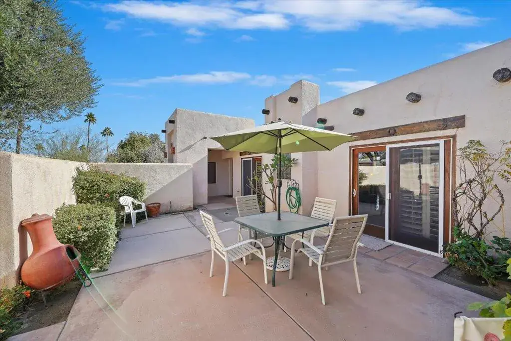 This charming 3-bedroom, 2-bath Santa Fe-style home blends cozy comfort with desert charm. Enjoy a stylish kitchen with island seating, a private hot tub, outdoor bonfire, and a dining area with scenic views. Located just minutes from the Tennis Garden, the home also features an office space with a Murphy bed, Spanish tile flooring throughout, and a washer/dryer for added convenience. Ideal for a relaxing getaway in a serene desert setting!