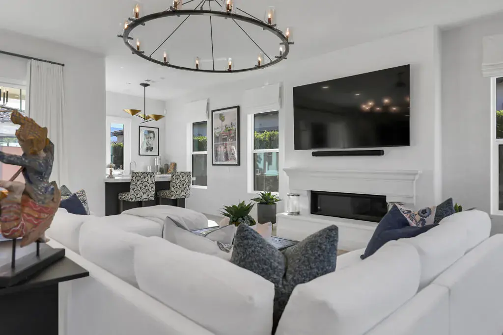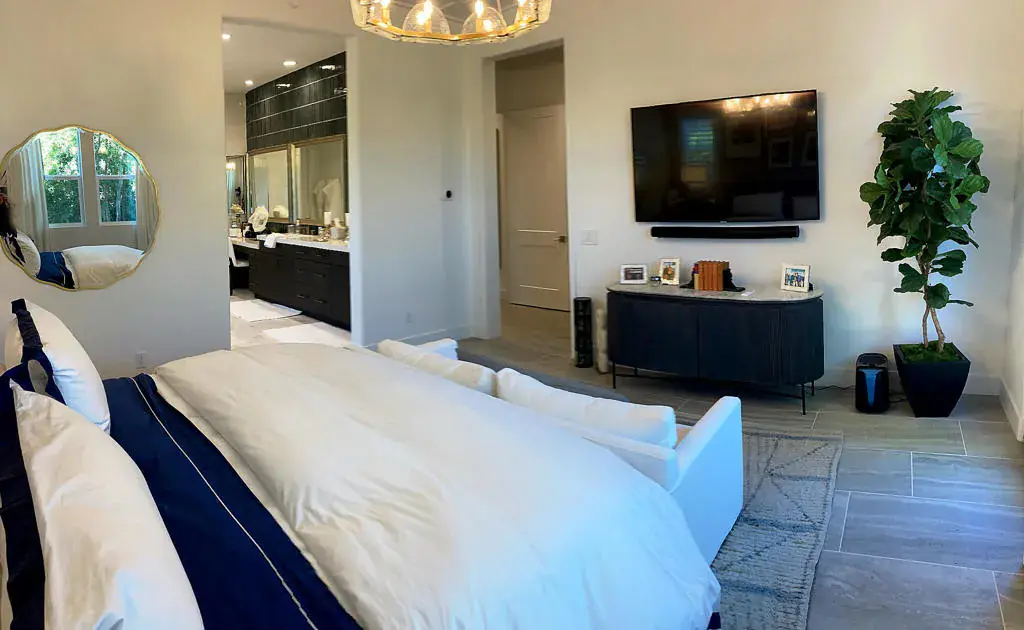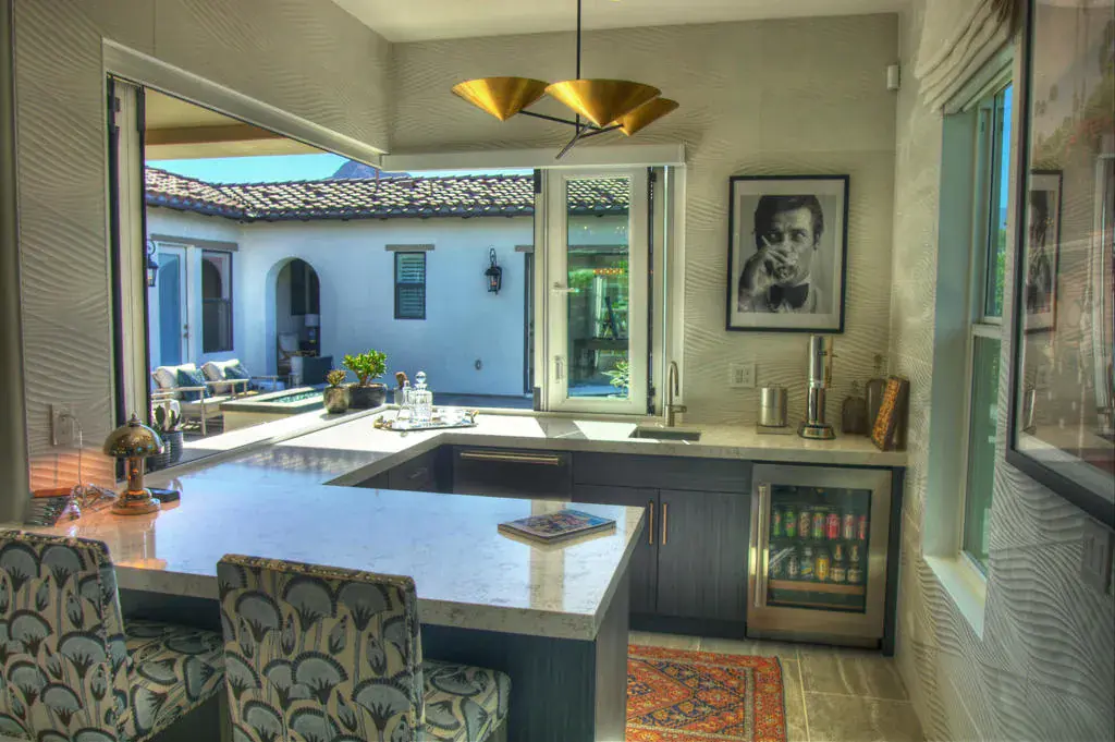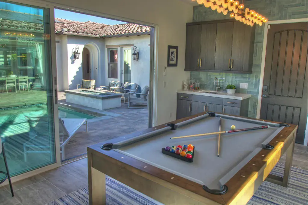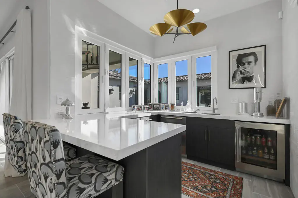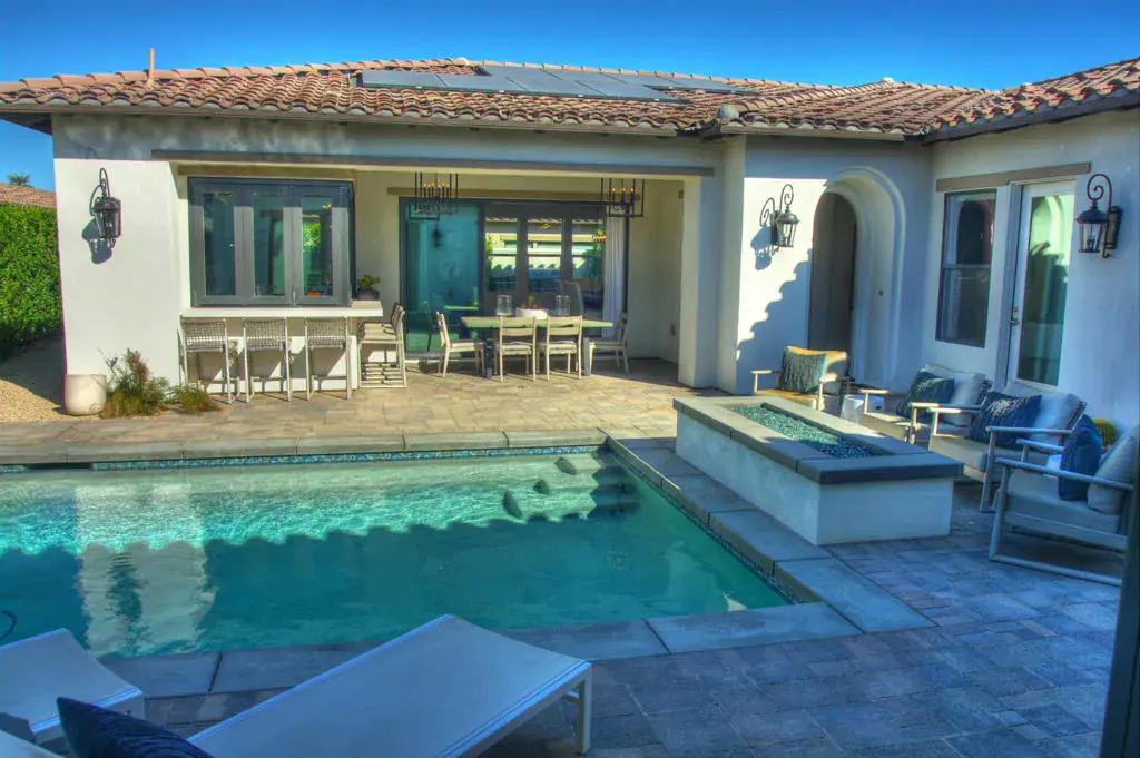 : Former Lennar Model Home with Casita and owned Solar! Located in the Province, a premier location of Indian Wells, this former Lennar model home has over $340,000 in flooring and interior upgrades at Builder cost! With floor, wall and ceiling treatments not found in a production home, this stunning home has an unmatched presence. Built around the custom pool and spa, the entertaining potential is truly notable, with covered outdoor dining . The entryway leads you past the detached casita and pool area to the main entry, where the well thought out floorplan takes over. All three interior bedrooms are en-suite with the primary suite well-separated from the secondary rooms. Designed for the desert indoor-outdoor lifestyle , this home opens up to the custom pool/spa and patio area through large sliders in the living room, a bar area that opens dramatically from the interior to the outside for serving and conversation along with doors from the 3rd bedroom and Casita. Designer furnishings available. for purchase