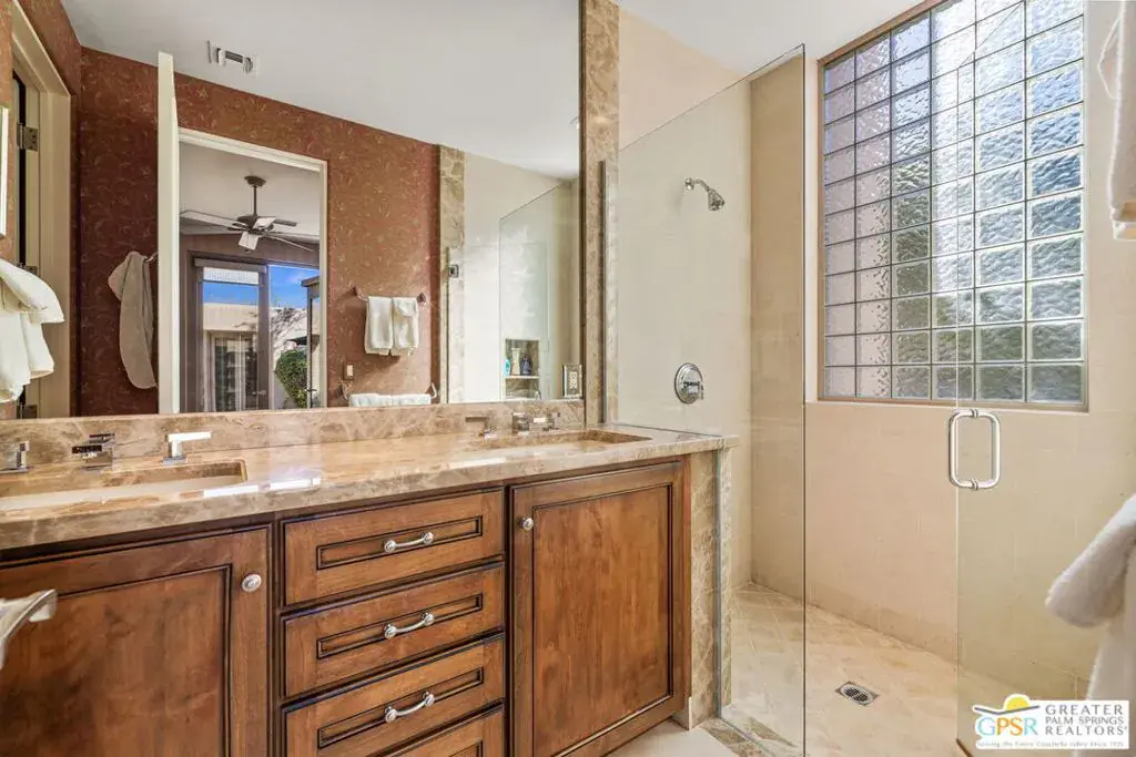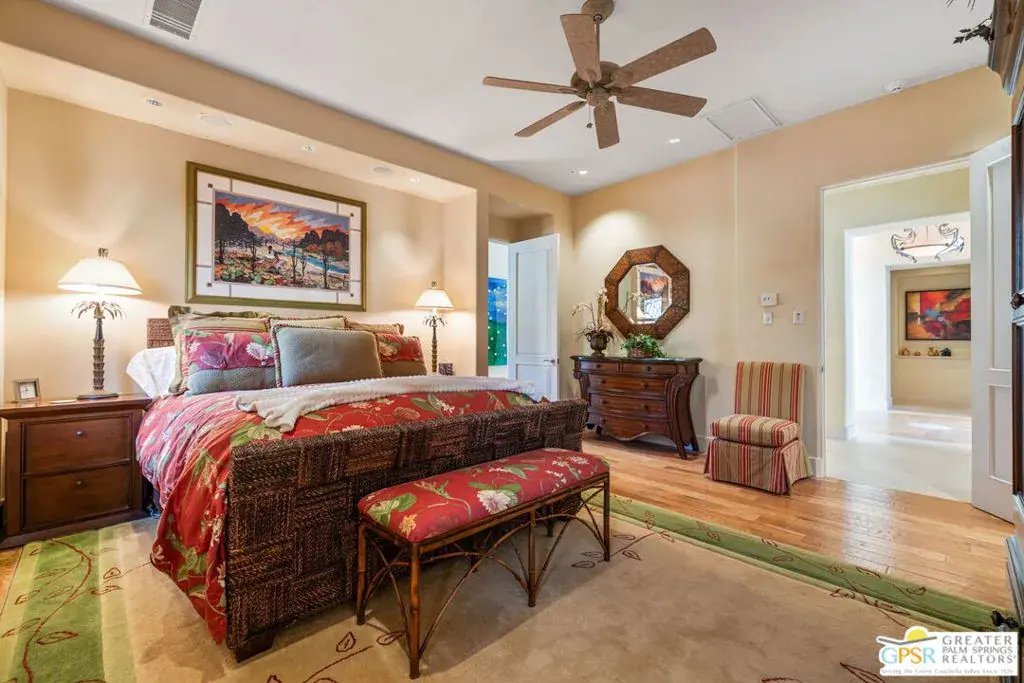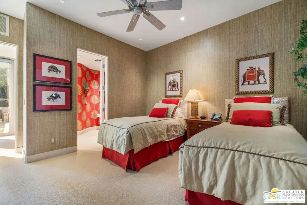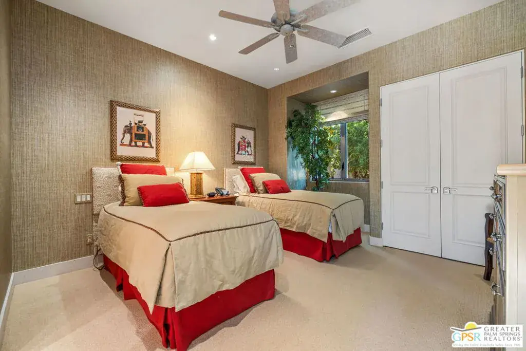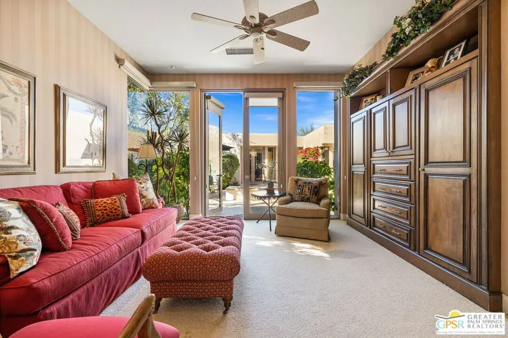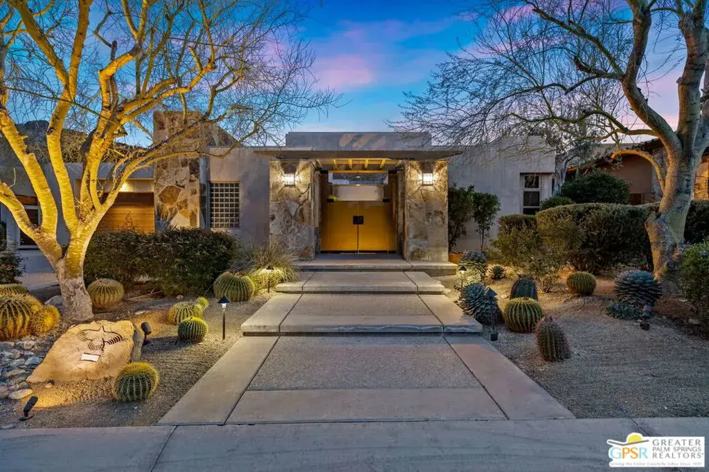 Set within the Indian Wells enclave of The Reserve Club, this desert contemporary residence overlooks the 15th fairway and captures sweeping south-facing mountain views from a setting prized for privacy, architecture, and natural beauty. Offering a highly flexible layout with multiple ensuite accommodations, this home is ideally suited for entertaining, hosting guests, or multi-generational living. Arrival is through a dramatic front courtyard framed by a private water fountain and gas fireplace – an inviting outdoor living space that also serves as the organizational heart of the home. Several of the private suites connect directly or indirectly to this courtyard, creating a true resort-style, casita-inspired experience. Inside the main residence, a rotunda entry opens to expansive living spaces with tall ceilings and floor-to-ceiling glass that frame pool, fairway, and mountain views. The formal living room features a gas fireplace, custom built-ins, and an adjacent wet bar, while a separate south-facing family room offers equally impressive views and its own fireplace. The gourmet kitchen is centrally positioned with generous island and breakfast bar seating, and provides convenient access to a built-in barbecue just outside – ideal for seamless indoor/outdoor entertaining. The Primary Ensuite is privately located and offers tall ceilings, wood flooring, and a well-appointed bath with dual private sinks, soaking tub, walk-in shower, and a generous custom walk-in closet. Junior Ensuite Two includes a private bath and opens directly to the courtyard. Junior Ensuite Three also features its own bath and enjoys courtyard access via a nearby hallway. Junior Ensuite Four is a standout casita-style suite with a separate exterior entrance and private bath perfect for guests seeking maximum privacy. The Den with private bath, direct access to the golf cart garage, and courtyard entry offers additional flexibility and can easily function as a fifth ensuite bedroom if desired. The south-facing backyard is a private retreat with a pool, elevated in-ground spa, gas firepit, and dramatic mountain backdrop – perfectly oriented for all-day sun and sunset views. Located in Indian Wells and just moments from the private clubhouse, life at The Reserve Club includes world-class golf, dining, fitness and wellness facilities, tennis and pickleball, and miles of scenic trails – all within a community defined by privacy, elegance, and a true sense of place. A bold architectural offering with exceptional flexibility, views, and value ready for its next chapter.