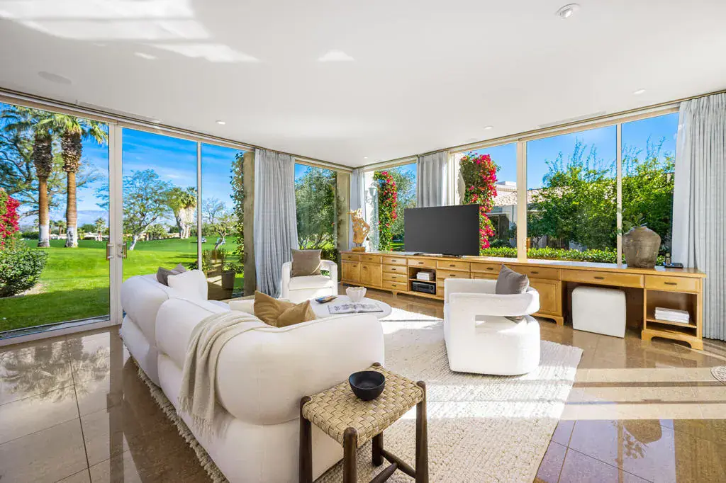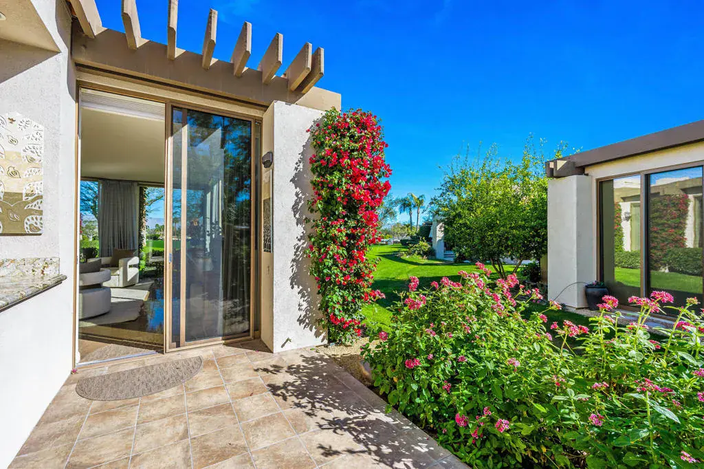 An expanded and all one-level Cottage is listed and available for a quick closing. The 2,887 square foot floor plan of this Cottage offers three bedrooms and three bathrooms with gourmet-style kitchen open to the living/family room with views to the Desert Course. Like other A’ Plan Cottages, the two-car and single-cart garage is attached for easy access to the residence. More unique is its cul-de-sac location which allows for a spacious sweeping driveway that can accommodate guest parking when friends and family come to visit. This Cottage is directly across from the community pool/spa entertainment area and is within easy walking distance to the Club’s amenities.Remodeled and update around a decade ago, the designer incorporated modern ceiling details, warm woods, and natural stone flooring and countertops. Professional lighting was put in place to heighten the viewing experience of the owner’s art collection. The gated entry courtyard with string lighting is large and offers a private space for dining and relaxing. The seller has included two sculptured glass flower gardens and a collection of outdoor art sculptures that are included in the purchase price. With the structural work done, this Cottage offers the ability for the buyer to purchase, redecorate, furnish, and enjoy their new home as the season opens this fall.