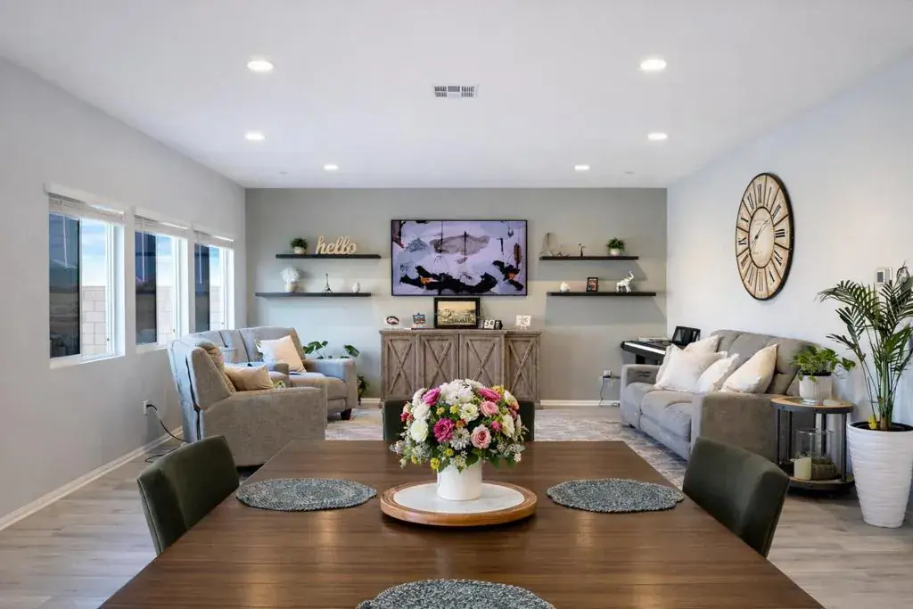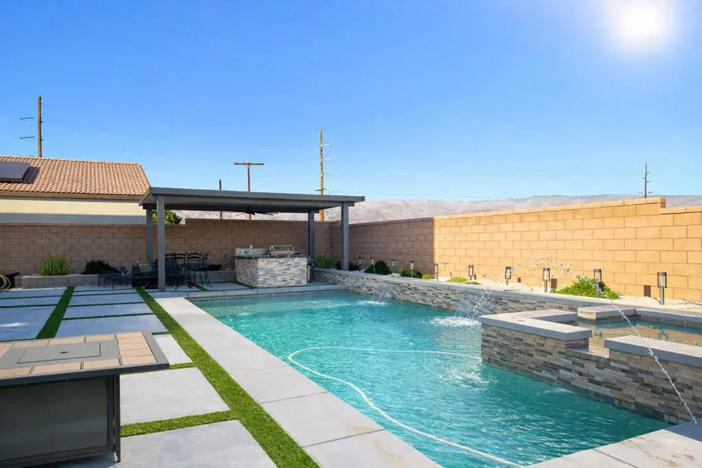 Located just inside the resident gate of Monte Vina, this exceptionally upgraded residence sets a new standard for the neighborhood. Built in 2021 and thoughtfully enhanced throughout, the home showcases luxury vinyl flooring across the entire interior, creating a clean, cohesive, and modern feel from the moment you step inside.The open-concept layout is filled with natural light and designed for effortless living and entertaining. The kitchen anchors the space with crisp cabinetry, stainless steel appliances, and a generous island that flows seamlessly into the living and dining areas–ideal for both everyday comfort and hosting.The backyard is where this home truly distinguishes itself. With no rear neighbors, the property enjoys unobstructed, panoramic views of the Little San Bernardino Mountains, offering a rare sense of privacy and openness. A resort-style pool and spa with striking water features take center stage, complemented by a covered patio, built-in BBQ area, and beautifully designed outdoor living spaces–perfect for entertaining or unwinding under desert skies. The oversized lot also includes RV parking and ample room for additional vehicles and recreational toys.Additional highlights include a versatile floor plan with four bedrooms, a private attached casita with its own entrance, kitchenette, and full bath–ideal for guests, extended family, or a home office. Take advantage of lower electric bills with a Sunrun Power Purchase Agreement to reduce monthly electric costs.This is not just a home–it’s the premier offering in Monte Vina, combining upgrades, privacy, views, and location in a way that rarely comes to market