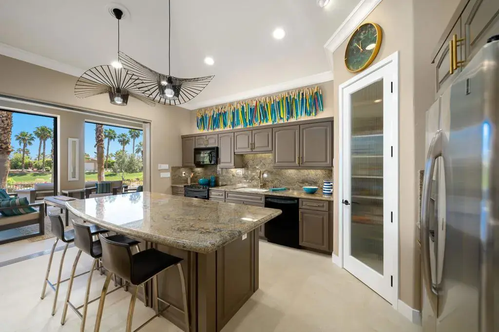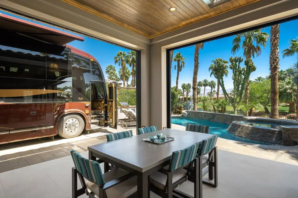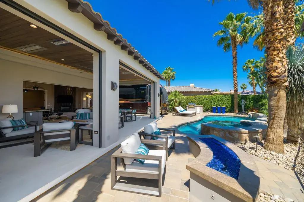 #106 DESERT SHORES RESORTOne of the most spectacular motorcoach properties you will ever find!Totally reimagined Exterior Elevation and Additions completed in 2021.The most lavish Outdoor Living Space you will find with:15′ x 32′ Solid-Covered PatioVoluminous 11′ CeilingsRaised Patio Floor matches interior floor height for seamless floor from indoor to outdoor living spaces.Full Bathroom for dinner guests and easy access from swimming pool.Patio includes both Electric Sunshades + Security Shutters which enclose the entire outdoor living patio keeps the patio safe and clean. (Security Shutters are included on all windows and sliders throughout the property)Built-In Space Heaters + Misting System.Cantilevered Patio Floor with underlighting.Beautiful Paverstone driveway and patio spaces and Epoxy Coach Pad.Freeform Pool with Quartize Spa with new Pebble Finish offers Raised Bond Beam at back of pool for privacy + LED Lighting and Pentair Remote Control System.Blue-Glass Fire Pit.BBQ grill area with wood-pellet memphis Smoker/Grill.Entry Gate for Privacy.Raised Santa Barbara Smooth Stucco exterior with Eldorado Stone Trim.Newer Landscaping and Ground Lighting.Raised RV HookUp Pedestal.Wrought-Iron Fencing to keep your Doggies secure.INTERIOR FEATURESRecent and Beautiful Remodeled Interior.Great Room/Kitchen opens to spectacular outdoor living spaces.Upgraded Granite Slab Counters.