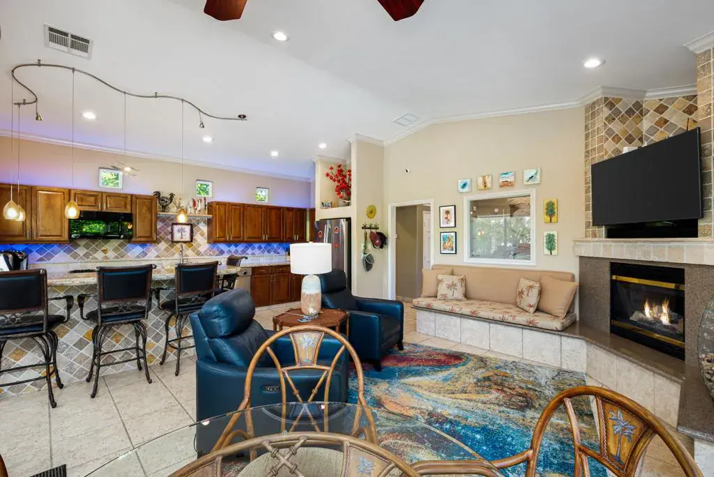 #8 DESERT SHORES RESORTLuxury Motorcoach Resort in the heart of Indio, California. Newer 525 Sq Ft. Guest Suite addition makes for a total of 2 Retreats and 2 Bathroom + Great Room/Kitchen for a total of 1,240 Sq Ft living space + Garage.(Garage dimensions = 18.5′ x 23′)Waterfront location with spacious outdoor living space with freeform Pool and Spa.Association includes clubhouse, tennis, pickleball, fitness center, community pool & spa, social activities, 24 hour, guard gated with high-tech perimeter security, trailer storage area, doggie park, front yard landscape maintenance & brand new super-speed FIOS internet