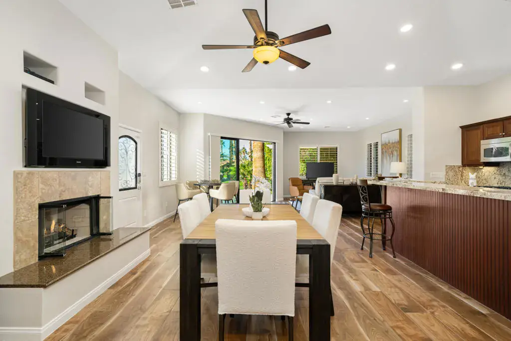 #93 DESERT SHORES RESORTExpanded Villa + Guest Cabana property is located on large, corner lot with greenbelt, Lake and waterfall views.Main Villa Sq Ft: 830Cabana: 373TOTAL LIVING: 1,558Garage: 370TOTAL STRUCTURE: 1,928Expanded Plan 30 floor plan with expansive living space with Living Room, Country Kitchen with Dining Space + a, spacious Retreat with en suite and walk-in closet + a detached Guest Cabana with kitchenette and batrhroom.Private corner location finished with pavestone decking and enclosed with wrought-iron doggie fence.The kitchen is equipped with maple cabinets and stainless-steel appliances including a refrigerator, oven range, dw microwave, Dining area has cozy fireplace for cool mornings and evenings.Association includes clubhouse, tennis,, pickleball fitness center, community pool & spa, social activities, 24-hour, guard gated with high-tech perimeter security, trailer storage area, doggie park, front yard landscape maintenance & brand new super-speed FIOS internet