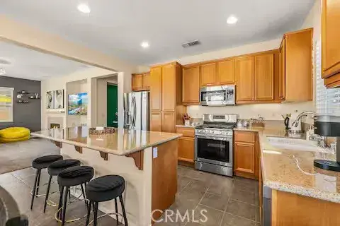 The home features an open family-room floor plan with a spacious kitchen complete with granite countertops, breakfast bar, and stainless-steel appliances and a water softener. The primary suite includes a walk-in closet and private ensuite bathroom. Enjoy a beautiful backyard, ideal for entertaining or relaxing after a day of desert activities.