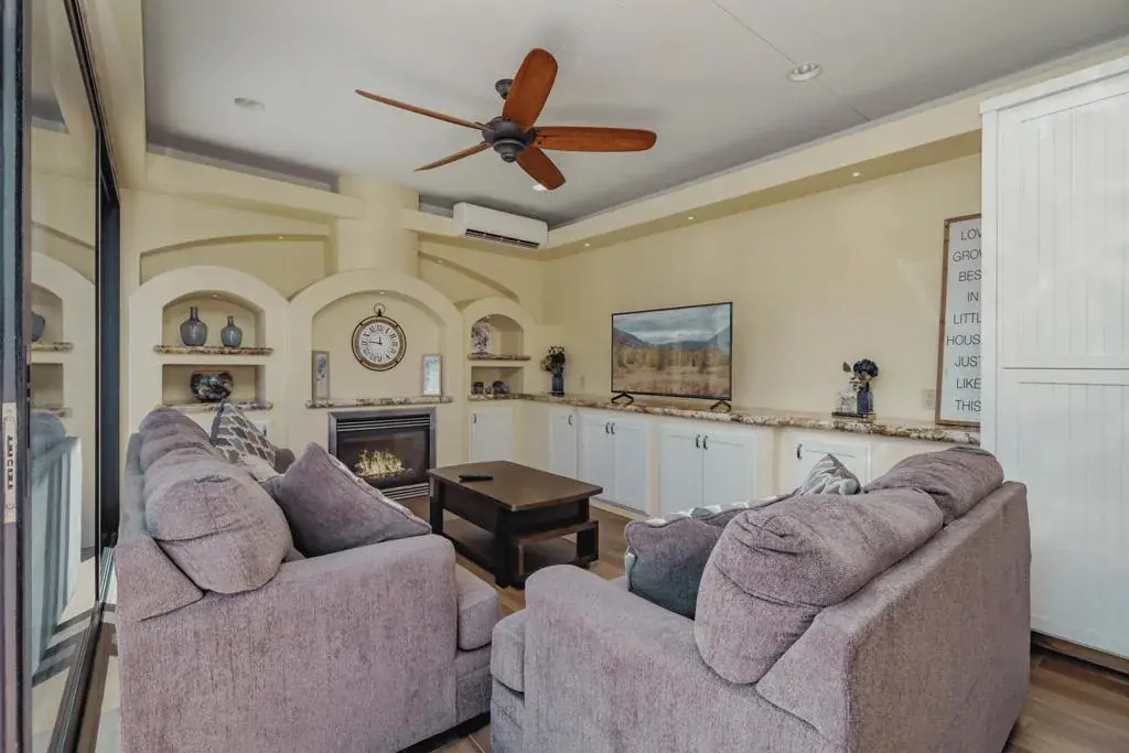 In the heart of Motorcoach Country Club, Lot 21 offers an unparalleled combination of privacy and luxury. Perfect for those who seek a serene escape, this developed lot features a large, beautifully designed pool with sound-canceling fountains and a relaxing hot tub with a spillway for the ultimate peaceful experience. The newly remodeled, glass-enclosed ”coach house” is complete with a gourmet kitchen, stainless steel appliances, a refrigerator, pantry, granite countertops, tile flooring, a pass-through bar, and even an ice machine. Enjoy the spacious indoor dining area and cozy living room, all fitted with ample cabinetry, air conditioning, ceiling fans, and a charming fireplace. The casita offers its own separate air conditioning, a convenient Murphy bed, a closet, and a stylishly tiled 3/4 bath, making it perfect for guests. The outdoor pool area is fully equipped with a BBQ, refrigerator, large sink, storage, and a washer/dryer housed in sleek stainless cabinets–ideal for entertaining in style. Currently being used as a rental property, Lot 21 has over 190 days booked this year at $195 per night plus a $100 pool heating fee, providing an attractive investment opportunity. Disclaimer: Rental income mentioned is for informational purposes only and does not constitute a guarantee of future earnings.