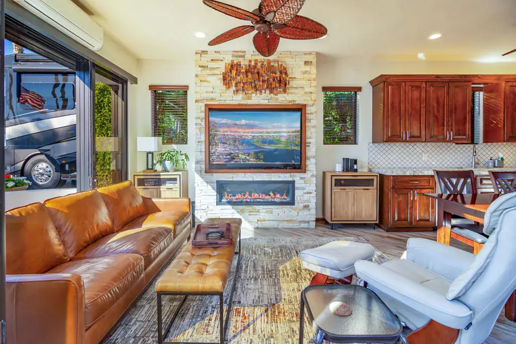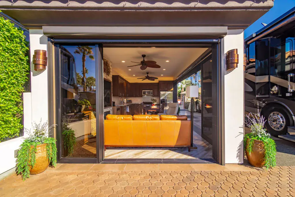 Lot 28 at Motorcoach Country Club is a beautifully designed privacy-developed lot that captures the essence of resort-style desert living. An expanded paver patio at the front of the lot provides convenient golf cart parking and creates a welcoming, functional entry.The heart of the lot is the tile-roof shade structure with attached casita, designed as a true indoor/outdoor living space. Stackable sliding glass doors allow the space to open completely for seamless entertaining or close to create a comfortable enclosed retreat. Inside, the layout lives like a home, featuring a cozy living area with fireplace, a dedicated dining space, and a kitchen area perfectly positioned for hosting gatherings large or small. The attached casita enhances everyday livability with a beautifully finished 3/4 bathroom, abundant cabinetry and storage, and a full-size stacked washer and dryer–making extended stays effortless.The backyard is where Lot 28 truly stands apart. This space offers a private, resort-like atmosphere. A large pool and spa anchor the yard, complemented by a soothing water feature that adds ambiance and movement. A tall rear privacy wall creates a peaceful setting, while the outdoor shower and BBQ island complete the experience–ideal for long afternoons by the pool, evening entertaining, or quiet desert mornings.Whether you’re looking for an all-season personal retreat, a seasonal escape, or a highly desirable rental opportunity, Lot 28 offers the perfect blend of comfort, privacy, and resort-style living. Thoughtfully designed and beautifully executed, this lot truly does not disappoint.Motorcoach Country Club exclusively accommodates Class A motorhomes from 30′ to 45′. Due to zoning, on-site properties are not considered dwellings, and overnight stays inside them are not allowed. MCC’s annual Food & Beverage minimum is $2,080.