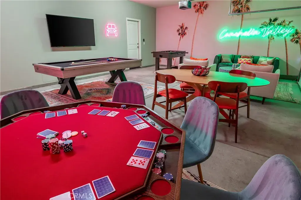 Enhancing the property’s appeal, the garage has been transformed into a stylish, fully equipped game room featuring a pool table and additional entertainment amenities, creating a standout experience for guests.