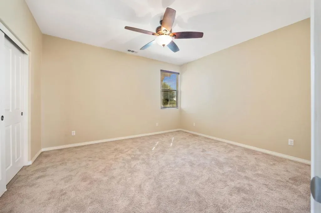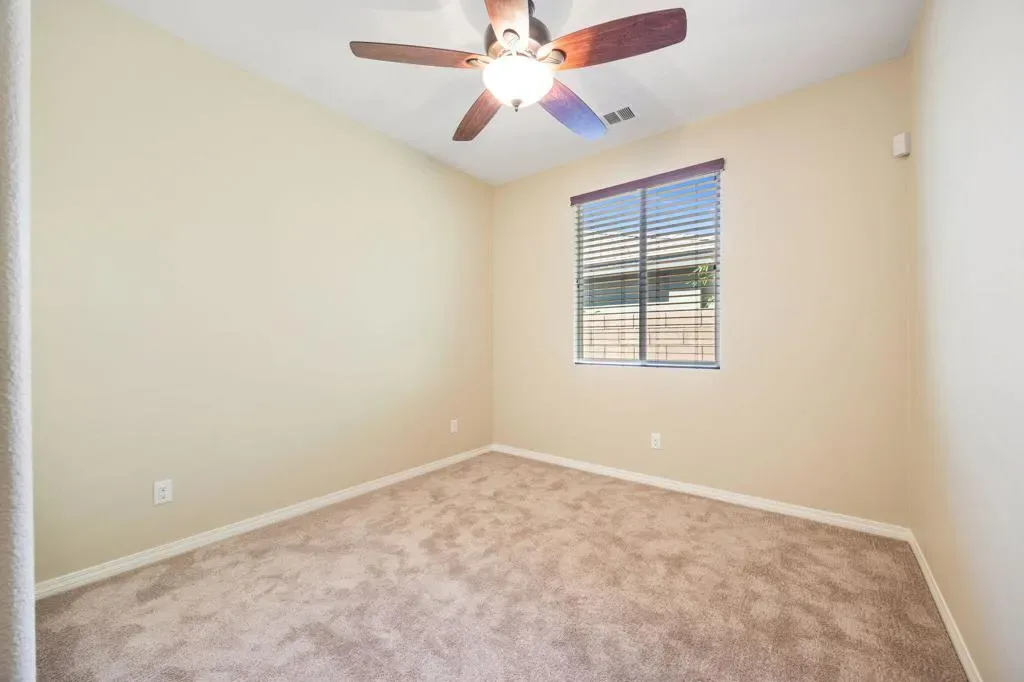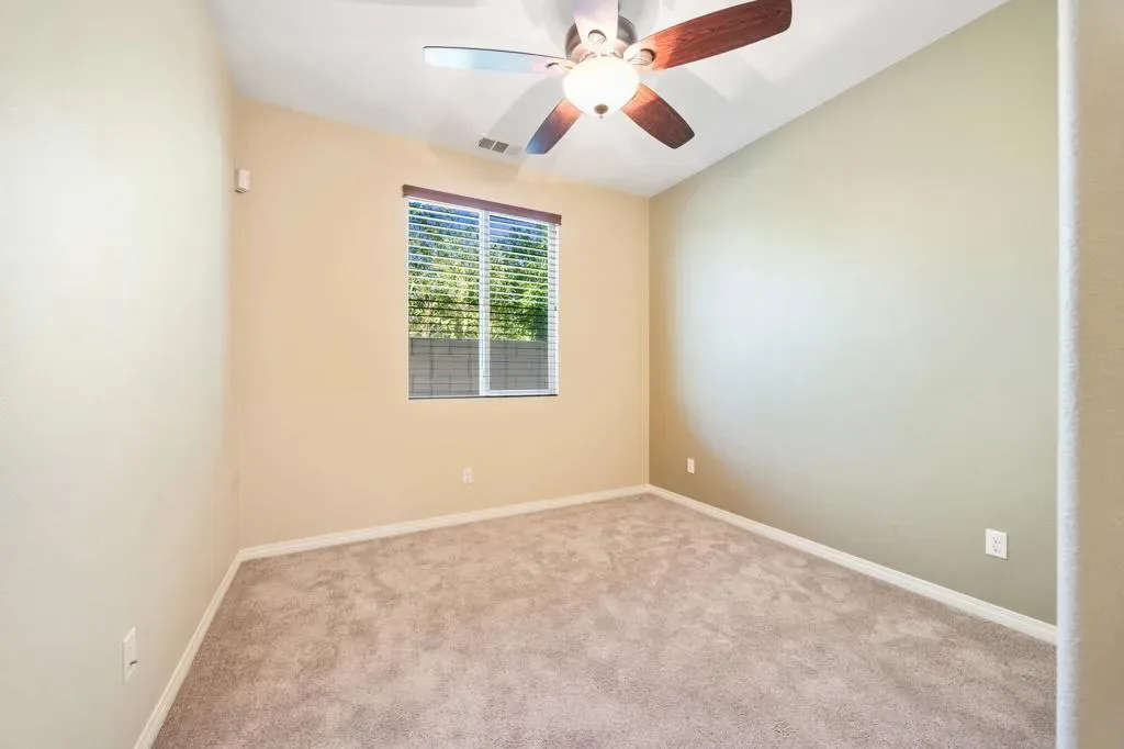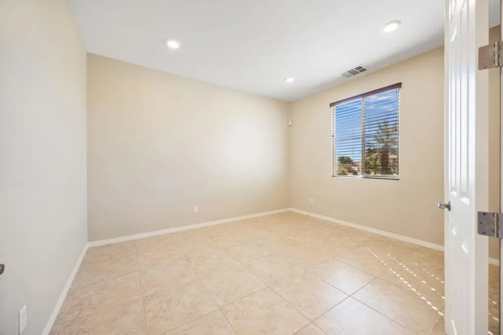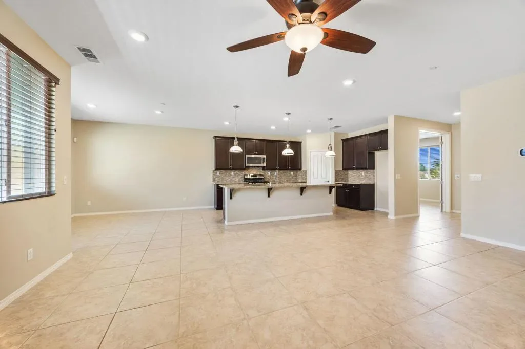 North Indio gated home on fee land in Aliante. This single-story 4 bedroom, 2 bath home offers approx. 2,032 sq. ft. on a low-traffic cul-de-sac with solar, a 3-car garage, and a long driveway for additional parking. The open-concept great room features expansive tile flooring, recessed lighting, and a stone fireplace. The kitchen opens to the living and dining areas and includes granite slab counters, a large island with bar seating, stainless appliances, dark cabinetry, and a walk-in pantry. A den off the main entry adds flexibility for a home office, media room, playroom, home gym, or possible additional sleeping space. Both bathrooms feature dual vanities, and the primary suite also includes a walk-in closet, soaking tub, and separate shower. The north-facing backyard offers a covered patio with recessed lighting, low-maintenance desert landscaping, and space to explore a future pool and spa. Residents enjoy a secure gated entry with a grand water fountain, plus a half basketball court, soccer practice area, dog run, playground, and illuminated walking trails. Well located near I-10, Golf Center Pkwy, revitalized Downtown Indio, and The Lights at Indio Golf Course, this is a compelling opportunity to secure a well-positioned North Indio home offering comfort and convenience.