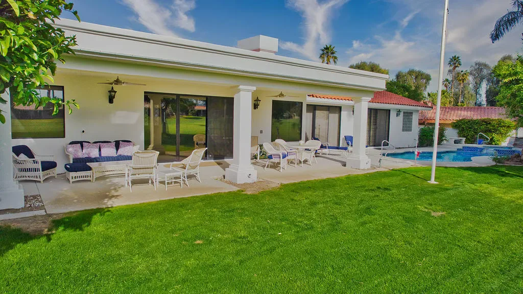Fabulous home with gated parking plus golf course view! 4 bedrooms, 4 bathrooms, office and fairway view on the par 5 13th fairway. Double door leaded glass entry doors open to volume ceilings, walls of glass, a floor to ceiling stone fireplace, a convenient sit-down wet bar. The island kitchen has slab granite counters and stainless-steel appliances. Primary suite with walk in closet and sliders to the pool area has a large jacuzzi soaking tub and spacious separate shower. There are two-bedroom suites. Another bedroom has glass sliding doors to the pool and covered back patio. There is a built-in BBQ. This is an entertainer’s delight! Two newer electric A/C systems. Owners include electricity, gas, water up to $200mo. Owners include cable TV with two boxes, Internet with Spectrum plus trash service. Electricity, gas, water is included up to $200.00 per month. Bermuda Dunes Country Club has 24-hour guard gate. 3-month minimum. Contact agent for more information. Owners use during month of April.