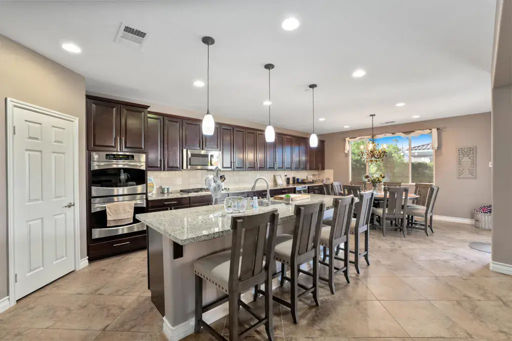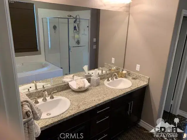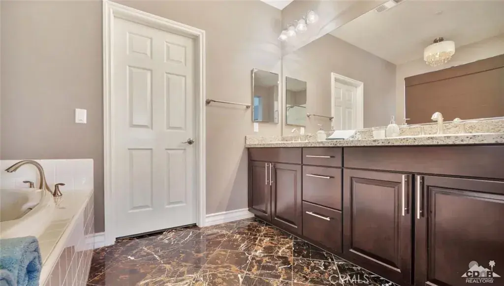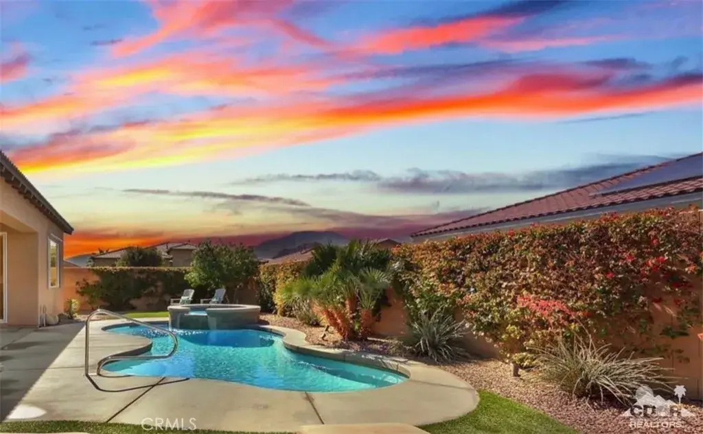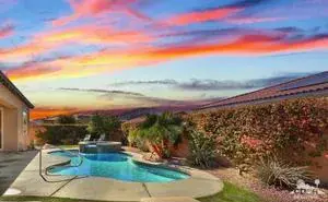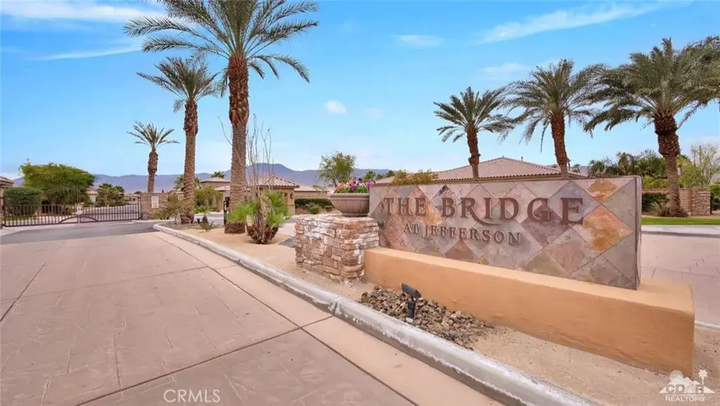 ALL DATES AVAILABLE!! The Bridge at Jefferson, a highly desirable gated community, enjoy the beautifully landscaped private backyard, with saltwater pebble-finished pool & spa, w/waterfall and long covered patio, which is ideal for entertaining while you relax and take in the mountain view. This open floor plan home offers a great room & impressive chef’s kitchen that includes SS appliances, double ovens, gas cooktop, beautiful espresso cabinets, stunning granite counters, large eating area. The inviting great room, which opens to the dining area, features stacked-stone fireplace with media niches and a view to your pool. The master suite is sure to please with backyard access, a master bath with dual sinks, jetted tub, marble flooring and huge walk-in closet. This beautifully presented home is located on a corner lot with 2764 SF, 4 Bdrms & 4 baths & offers a split master w/guest rooms on the other side of the home. This is the perfect vacation home. (120 day Minimum booking)