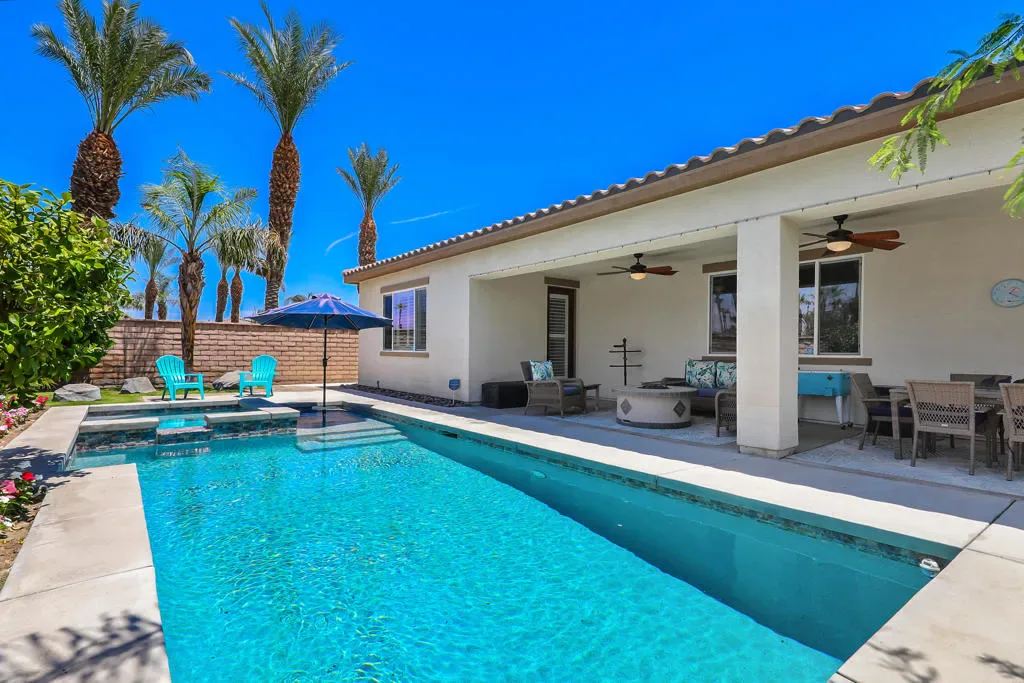 Welcome to The Bridge at Jefferson–where prime location meets luxury living! This home is ideally situated near top-tier shopping, dining, golf, and has all of the incredible amenities La Quinta has to offer. This former model home is truly one of a kind. This home features high-end upgrades throughout and is offered turnkey furnished, ready for you to enjoy the ultimate desert lifestyle.Step outside to your private oasis with a covered patio, sparkling pool and spa, built-in BBQ/bar area, and a high-pressure misting system to keep you cool on warm desert days. Inside, the open-concept layout showcases a spacious chef’s kitchen with generous storage, perfect for entertaining.The home is thoughtfully designed for comfort and privacy, with an attached casita/suite featuring a mini-fridge/coffee bar on one side, and luxurious primary suite on the other. The remaining two bedrooms are of ample size. This home is one not to miss!Don’t miss this rare opportunity to own a beautifully upgraded home in one of South Indio’s most desirable communities!