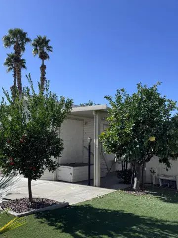 Located in the beautiful Desert Aire resort. Desert Aire is an over 55, pet free, 9 month park. Desert Aire does not permit full time residency. This park is primarily used by snow birds looking to spend the winters in our warmer climate.WOW, check out this 2002 Hallmark park model with views of the mountains and one of the many water features located through out the park. With over 10,000 dollars in landscaping in artificial turf and several mature fruit trees that produce an abundance of different varieties of fruit, there is no outside maintenance.There is a large wrap around patio with a large patio cover that runs along the side of the park model. You will enjoy lots of sun in the mornings on the back patio and plenty of shade in the late afternoon.The interior features vaulted ceilings and large windows creating a bright and airy feel. There are ceiling fans in the living room and bedroom. The kitchen is open and offers plenty of storage and includes a dishwasher. The bathroom has tall ceilings and a walk in shower which is a desirable feature in these park models. The bedroom is open and spacious with more tall ceilings and plenty of storage.All interior and exterior furnishings are included making this move in ready.