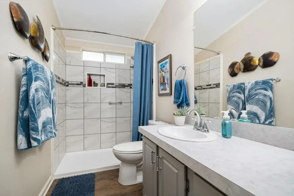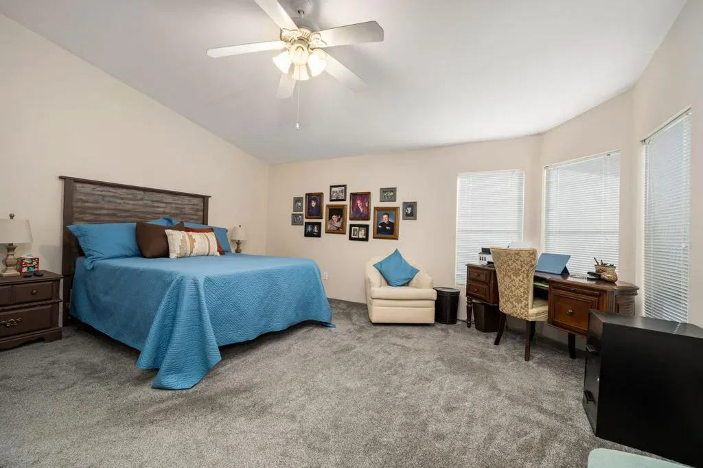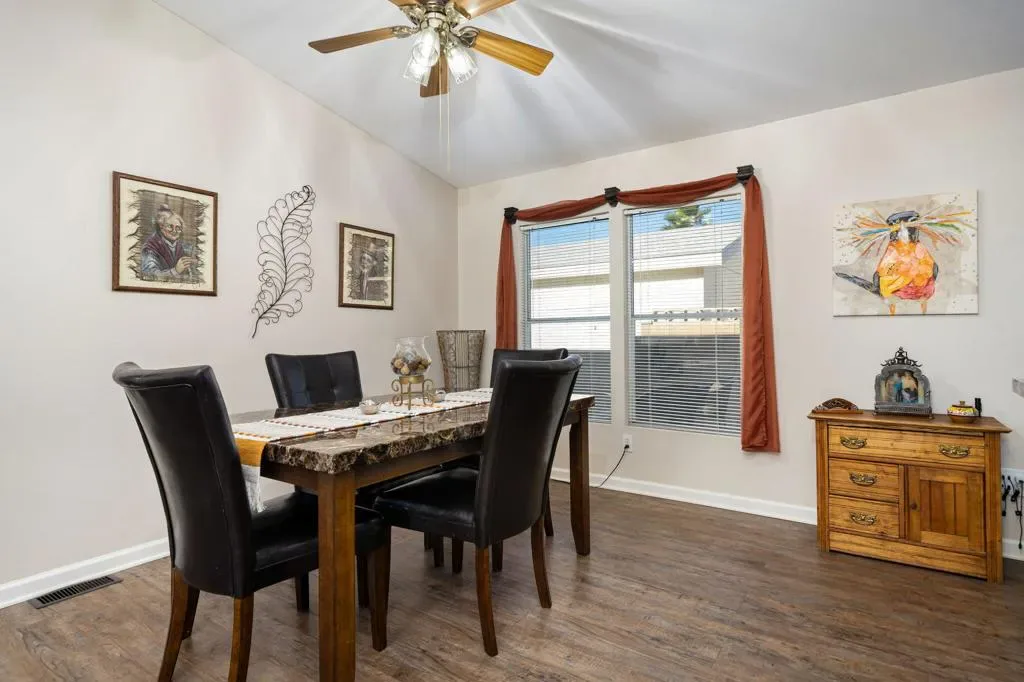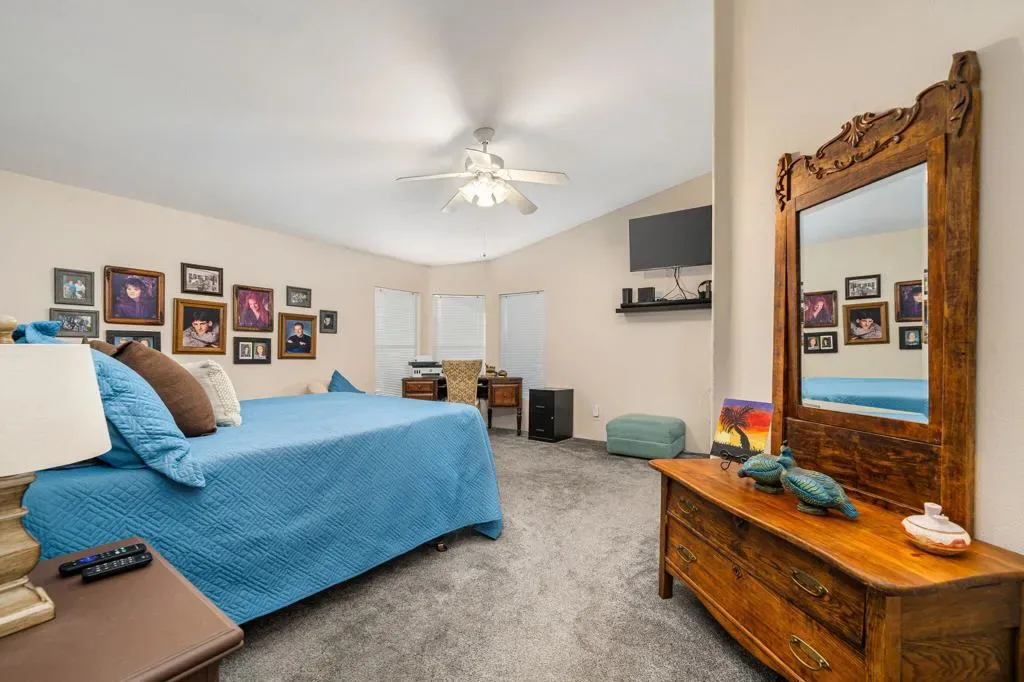Beautiful Desert Grove–an active, 55+ community! Come see this sought-after location on a great block framing the residential definition of quaint, cozy, and charming. A recent interior renovation touches the key design features you seek; this classic 3-bedroom, 2-bathroom double-wide home offers light-and-bright interior living spaces. An open living room with high ceiling adjoins the easy-access ”Cook’s Kitchen” with stainless appliances and roomy dining area. An ideal split floorplan separates comfortable bedrooms 2 and 3 from the invitingly-large primary bedroom with Wow! ensuite bathroom and walk-in closet. Attractive, low-maintenance exterior landscape surrounds. Enjoy your own privacy-retreat covered patio and backyard area with flowers abloom; a place where quietude and serenity abound. You’ll find a two-car detached garage complete with work bench and cabinets. On-site RV parking available for a nominal fee. The low HOA fee includes access to two sparkling pools, spas, tennis, and pickleball courts, and common area maintenance. This desirable property–a cinch to maintain and offering a secure lock & leave lifestyle–is ideal for those seeking an enjoyable yet peaceful retirement setting located just minutes from fine restaurants, great shopping, and top medical facilities. Land is owned, not leased. Don’t miss this great Desert Living opportunity!
