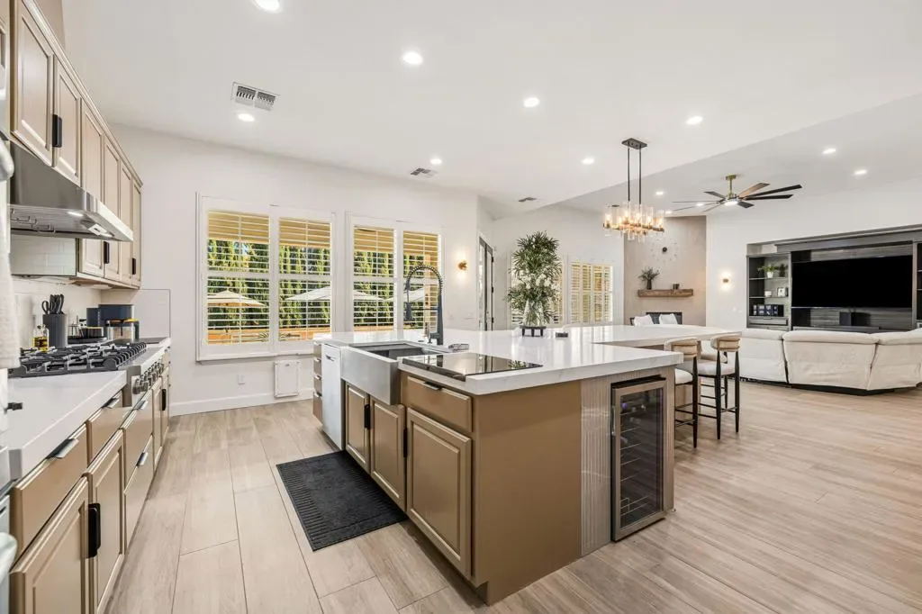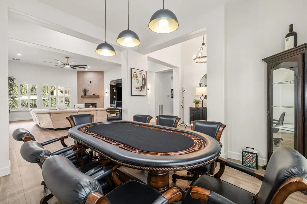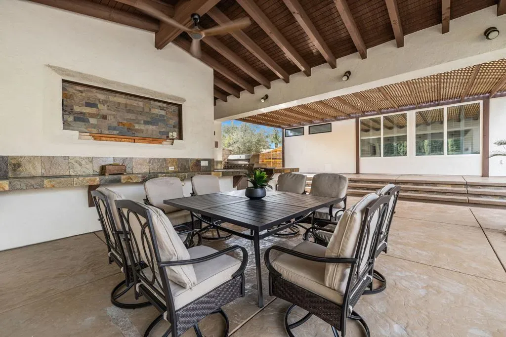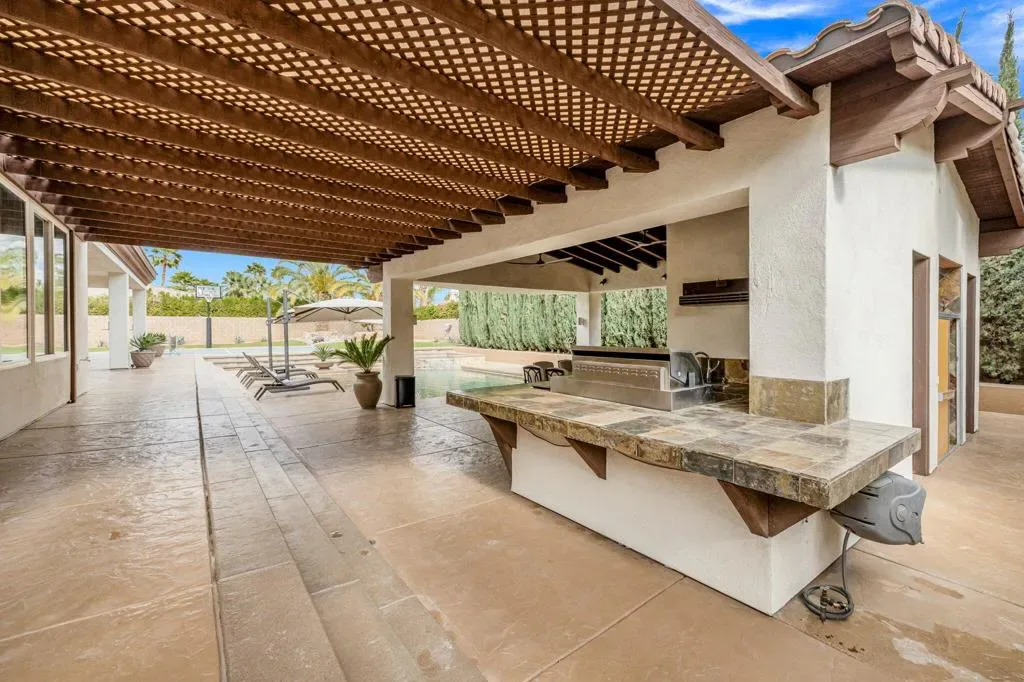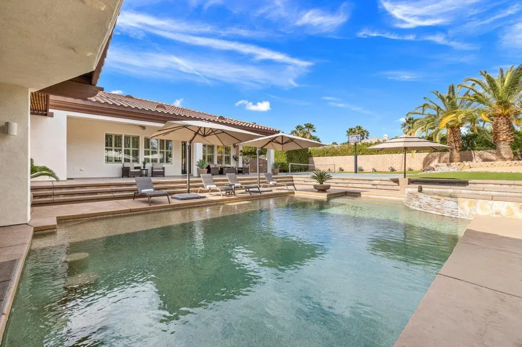 Equal to a 5-Star estate, this newly ($350k) top of the line remodel, boast numerous amenities.. Highlighted features are pickle ball court, oversized driveway, three car garage, corner location, outstanding backyard features. New tile floors throughout, and new shutters on all the windows. This 4 bedroom, + office, 3.5 bath, sold furnished home is located on a 1/2 acre parcel. Open concept living and dining. Dining and seating bar together accommodate 12 comfortably. Great room has big screen HDTV, DVD, cozy gas fireplace and comfortable furnishings. Amuse yourself with 8 seated casino style poker table with spaces for drinks, cards; to include shuffler and poker chips.Gourmet kitchen. Slate counter tops. All new Cosmo appliances. The fully equipped, gourmet kitchen has six burner gas cook-top, double ovens, microwave & dishwasher and large subzero refrigerator. Equipped with everything you need.All bedrooms and baths have clean and comfortable beds, etc. Home has 3 Queens, One Master King bed and office can accommodate twin beds, or hide-a-bed. or office furniture. TV’s in all rooms.Master bedroom is on pool/spa side of the house with double slider to a large patio. The luxurious Master Suite features a King-size bed, TV. Oversized master bathroom area and oversize separate tiled shower and freestanding tub.The Outdoors Resort Style is amazing. Get ready to relax and enjoy the extra-large saltwater pool & spa, overhead waterfall, bar seats, & basketball hoop and pickle ball court/ or make it tennis. The pool also has a tanning shelf with lounge chairs that fit perfectly so you can truly kick back and enjoy your new home. Outdoor kitchen with huge built in BBQ, sink, fridge, lighting, fans and dining table with seating for 8. The other large covered outdoor patio area off the great room also has a dining table with seating for 8. Behind the outdoor kitchen are two convenient outdoor separate bathrooms, one for men and one for women as well as an outdoor shower. Super nice.Other Amenities: High-speed wireless internet, Cable TV available. fully-equipped laundry room with washer & dryer, ironing board & iron. Oversized driveway for 6 cars plus 3 car garage. Doesn’t get any better..Come see this beauty…