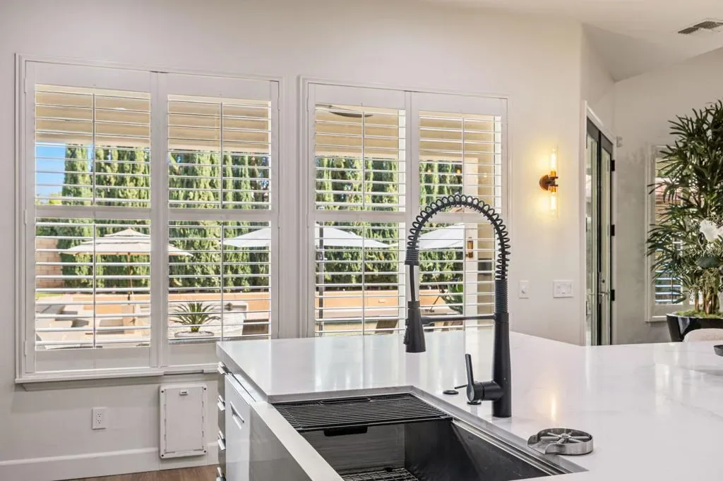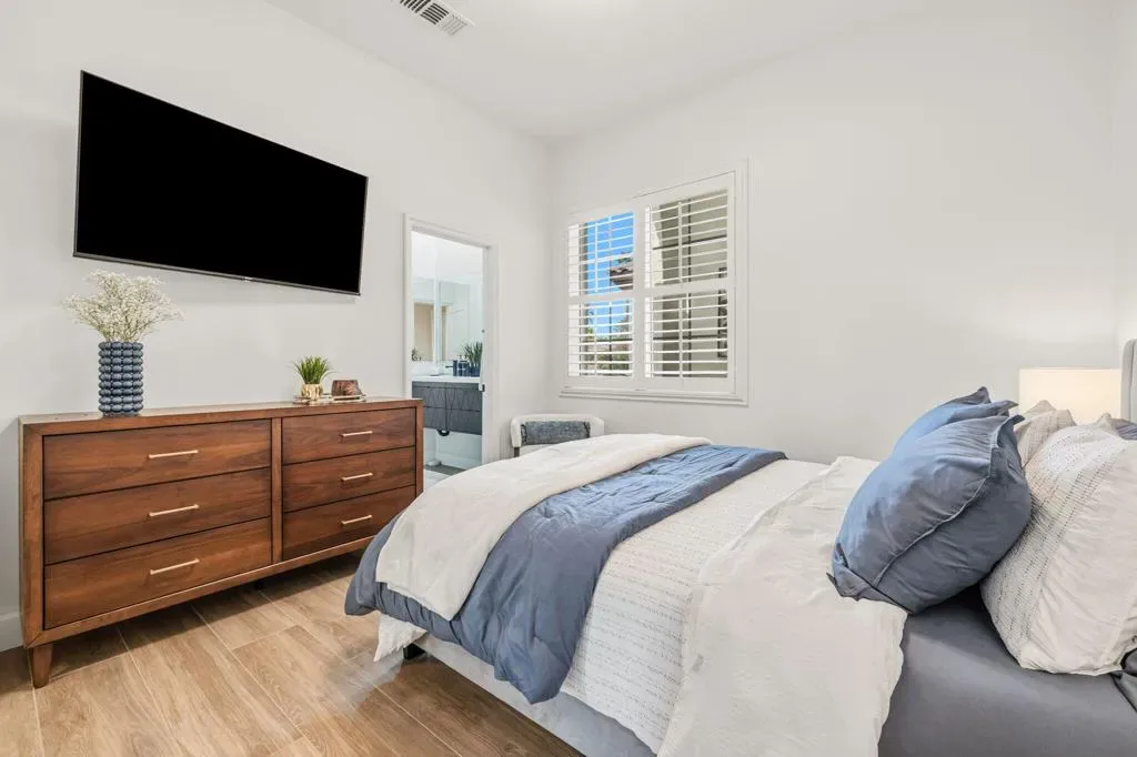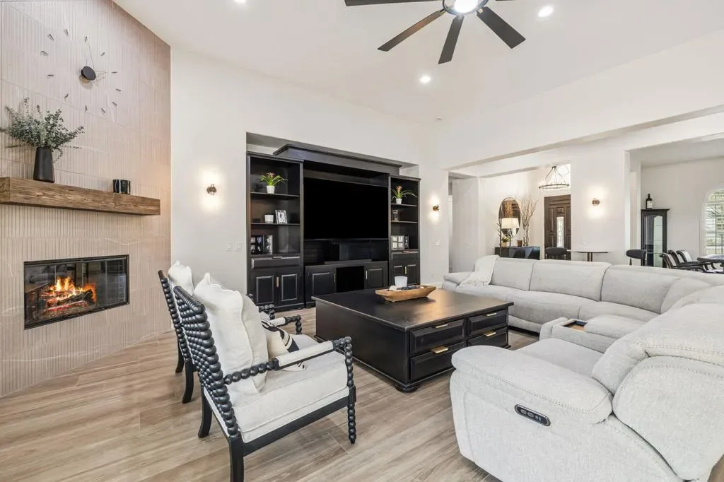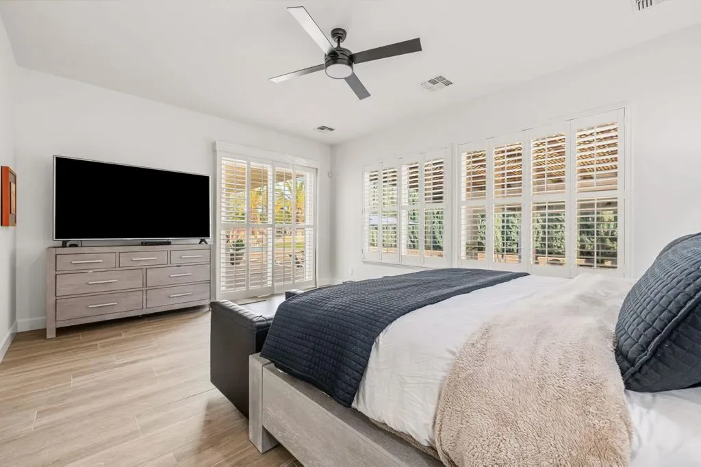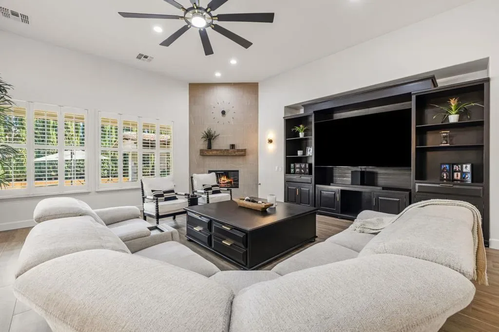 Equal to a 5-Star estate, this newly ($350k) top of the line remodel, boast numerous amenities.. Highlighted features are pickle ball court, oversized driveway, three car garage, corner location, outstanding backyard features. New tile floors throughout, and new shutters on all the windows. This 4 bedroom, + office, 3.5 bath, sold furnished home is located on a 1/2 acre parcel. Open concept living and dining. Dining and seating bar together accommodate 12 comfortably. Great room has big screen HDTV, DVD, cozy gas fireplace and comfortable furnishings. Amuse yourself with 8 seated casino style poker table with spaces for drinks, cards; to include shuffler and poker chips.Gourmet kitchen. Slate counter tops. All new Cosmo appliances. The fully equipped, gourmet kitchen has six burner gas cook-top, double ovens, microwave & dishwasher and large subzero refrigerator. Equipped with everything you need.All bedrooms and baths have clean and comfortable beds, etc. Home has 3 Queens, One Master King bed and office can accommodate twin beds, or hide-a-bed. or office furniture. TV’s in all rooms.Master bedroom is on pool/spa side of the house with double slider to a large patio. The luxurious Master Suite features a King-size bed, TV. Oversized master bathroom area and oversize separate tiled shower and freestanding tub.The Outdoors Resort Style is amazing. Get ready to relax and enjoy the extra-large saltwater pool & spa, overhead waterfall, bar seats, & basketball hoop and pickle ball court/ or make it tennis. The pool also has a tanning shelf with lounge chairs that fit perfectly so you can truly kick back and enjoy your new home. Outdoor kitchen with huge built in BBQ, sink, fridge, lighting, fans and dining table with seating for 8. The other large covered outdoor patio area off the great room also has a dining table with seating for 8. Behind the outdoor kitchen are two convenient outdoor separate bathrooms, one for men and one for women as well as an outdoor shower. Super nice.Other Amenities: High-speed wireless internet, Cable TV available. fully-equipped laundry room with washer & dryer, ironing board & iron. Oversized driveway for 6 cars plus 3 car garage. Doesn’t get any better..Come see this beauty…