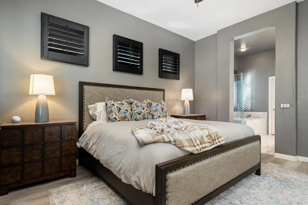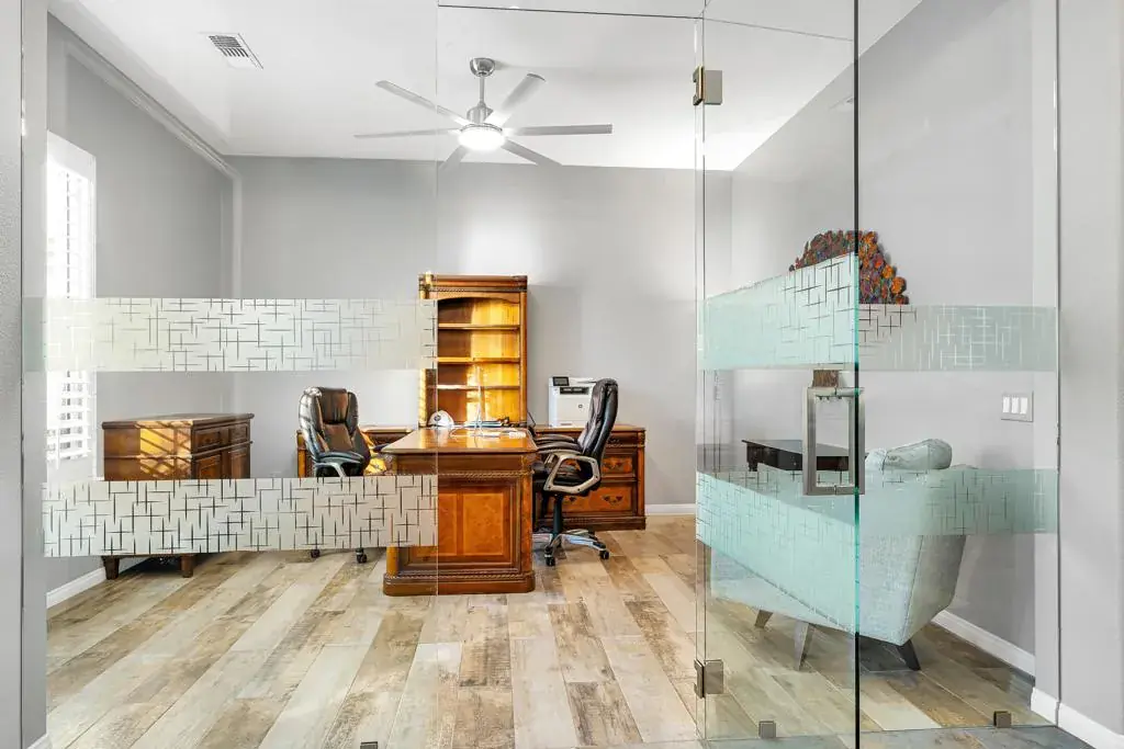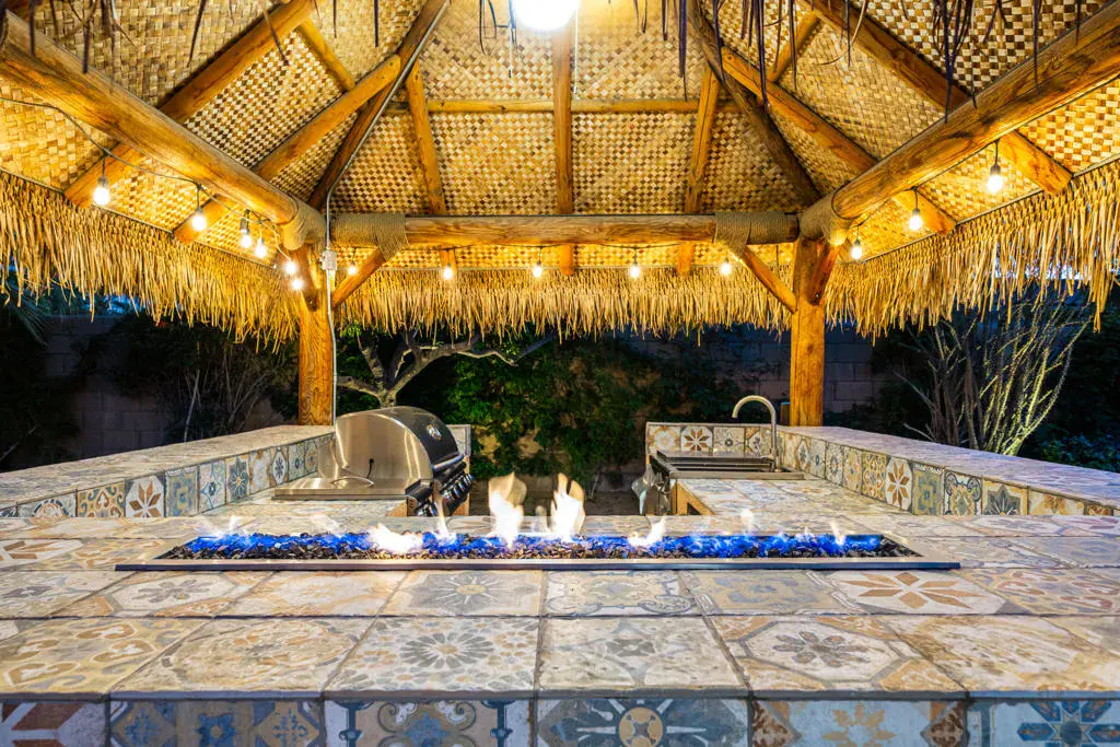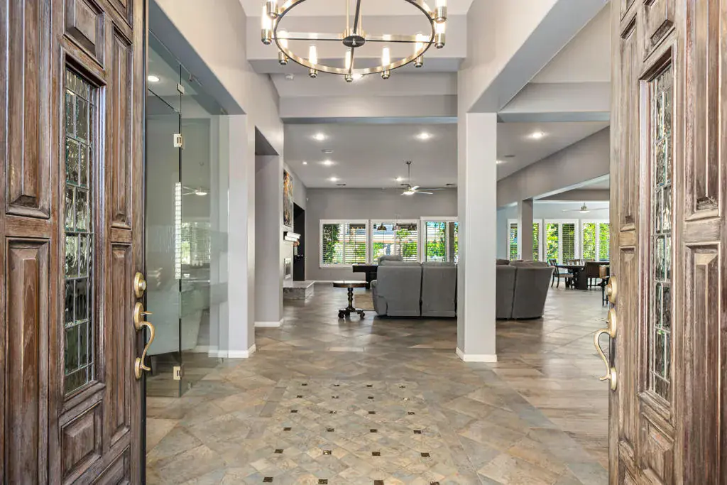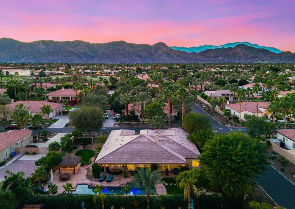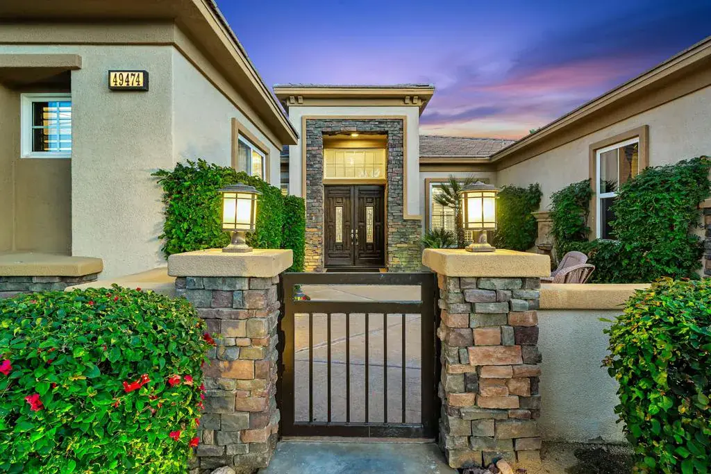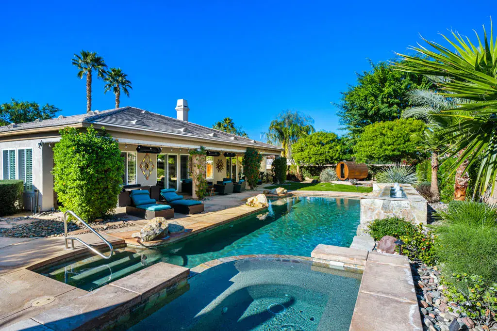 Located in Desert River Estates, a hidden gem on the border of La Quinta and Indio, this extensively upgraded residence sits on a generous half-acre corner lot and offers elevated indoor-outdoor desert living with a warm, inviting feel. Fully furnished and thoughtfully refreshed, the home spans 4,056 square feet and includes four bedrooms total (including the attached casita), a den, and three and a half baths. The casita offers both a private entrance and direct access to the main home, providing exceptional flexibility for guests or multigenerational living.The backyard feels like a private resort, featuring a saltwater pool and spa with newly updated equipment, elegant fountains, raised seating areas, a private outdoor sauna, and a newly added palapa roof over the outdoor kitchen. A large, covered patio with custom misters, patio heaters, and an 85-inch motorized hideaway television creates the perfect setting for entertaining or relaxing, while a new handrail offers convenient access to the pool. Inside, soaring 12-foot ceilings and an open layout create a light and welcoming atmosphere. The expansive great room showcases custom built-ins, a fireplace, surround sound, and an adjacent game area ideal for gathering with family and friends. The remodeled kitchen features all-new Bosch appliances, a Samsung refrigerator, and multiple dining options including a breakfast area and formal dining room. A glass-enclosed office near the entry provides a stylish and functional workspace.The primary suite opens directly to the pool and yard and features a newly remodeled bath and an oversized closet. New flooring throughout all bedrooms and closets, interior shutters throughout the home, updated lighting and ceiling fans, two new air conditioners, an instant hot water heater, and a whole-home water softening and filtration system complete the extensive list of upgrades. Tasteful new furnishings have been added throughout the living spaces, primary suite, and casita, making this residence truly move-in ready.Whether entertaining on a grand scale or enjoying quiet desert evenings, this home offers comfort, style, and effortless living in one of the area’s most desirable yet understated communities.