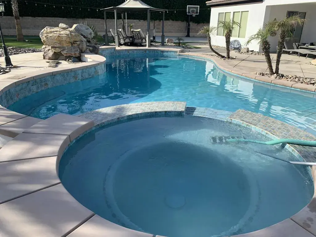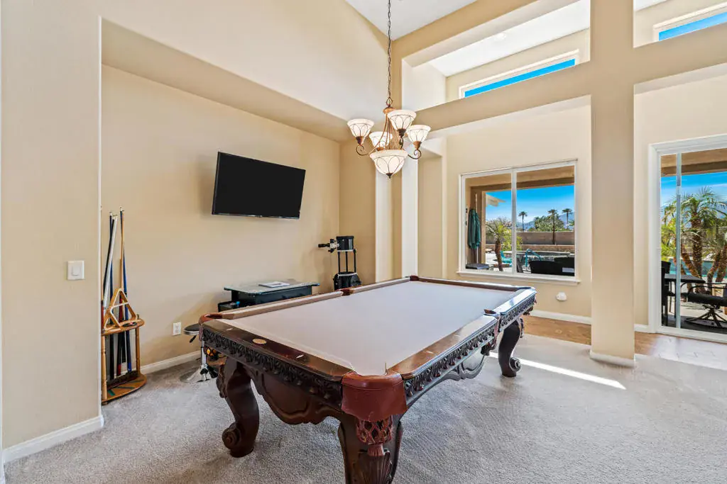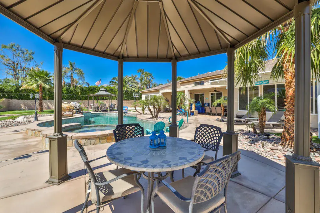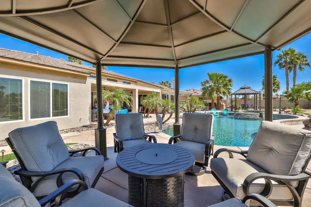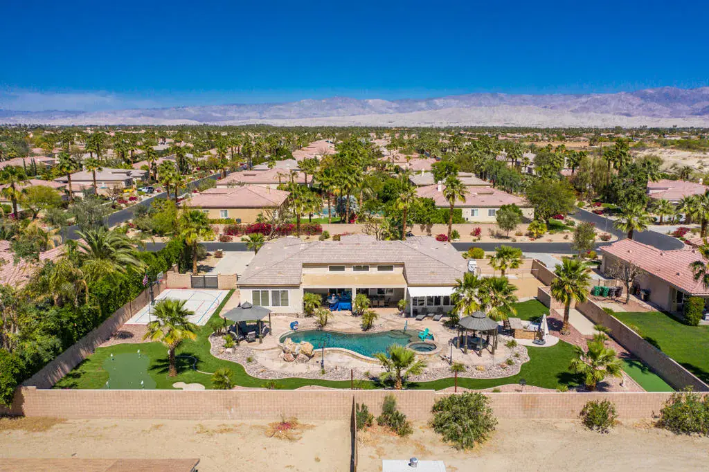 AVAILABLE ALL MONTHS!! Located in Desert River Estates located near the Polo Grounds where Coachella, and Stagecoach music festivals take place. It is spacious inside and has a great pool and outdoor relaxing area with mountain views. The great room has plenty of seating for your guests, the 65 inch flat screen TV or a quiet evening enjoying a roaring fire or glorious mornings allowing the natural beauty and sunlight to come in through the vast glass windows and doors. This home is set up perfect for entertaining with the seamless flow from the living area to the gourmet kitchen hosting stainless steel appliances including double ovens, granite countertops and a large island. The island comes equipped with 4 barstools for quick dining, adjacent to the kitchen table for 6. For more elegant dinners, the dining room offers seating for 8. The master suite offers a king bed, flat screen and private exit to the back patio. The master bath offers his and her sinks, a vanity area, soaking tub with a separate walk in shower. The second suite offers a queen bed, flat screen and a private full bath. The third bedroom hosts a queen bed and fourth bedroom hosts two twin beds, flat screens with a Jack and Jill bath. The fifth room doubles as an office and an extra bedroom with a daybed with a trundle below. The back patio oversized pebble-tec pool with a tanning shelf, pool umbrella and pool lounge chairs. Built in BBQ & Basketball court. Pack your bags..