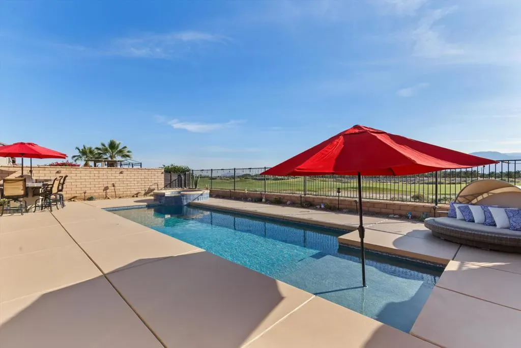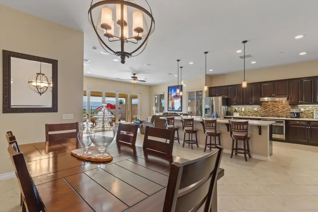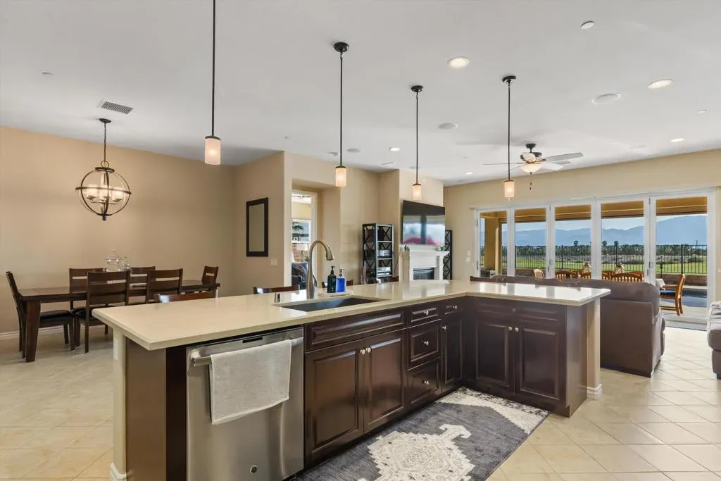 Welcome to resort style living at its finest in the prestigious guard gated community of Four Seasons Terra Lago. This beautifully appointed 3 bedroom, 2.5 bath home spanning 2,152 square feet offers an unparalleled combination of elegant interior spaces and breathtaking outdoor living, all set against sweeping golf course and mountain views.Step inside to discover a grand open-concept great room where the gourmet kitchen, dining, and living areas flow seamlessly together beneath soaring ceilings. The chef’s kitchen features rich espresso cabinetry, a stunning mosaic tile backsplash, stainless steel appliances, and an oversized island with bar seating for five, perfect for entertaining. Walls of sliding glass doors bathe the interior in natural light while framing postcard worthy views of the fairways and San Bernardino Mountains beyond.Outside, your own private oasis awaits. The expansive covered patio, complete with a ceiling fan, mounted TV, and outdoor kitchen with dining for eight, overlooks a sparkling lap pool and spa with cascading waterfall. As the sun dips below the mountains, the pool lights illuminate and the desert sky transforms into a canvas of color, making every evening feel like a special occasion.Residents of Four Seasons Terra Lago enjoy world class 55+ community amenities including a clubhouse, fitness center, tennis and pickleball courts, and an active social calendar, all just minutes from the shopping, dining, and entertainment of the greater Palm Desert area.This is more than a home. It’s a lifestyle.