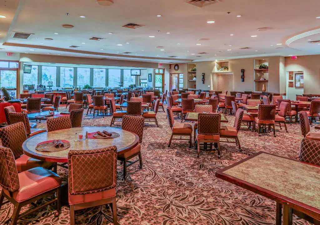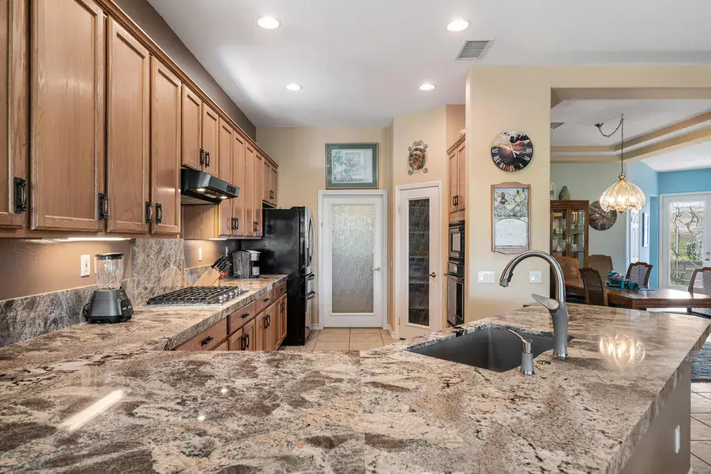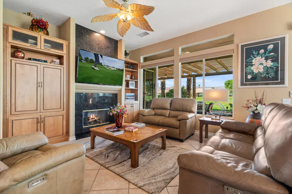 Popular extended Newport plan with spectacular VIEWS of the 6th fairway and mountains. Featuring an attractive slate stone entryway courtyard with artificial turf and leaded glass entry door. This OPEN layout home with 2 BDRMS plus a DEN has a beautifully remodeled kitchen with one level slab granite kitchen counters, new oven, gas cooktop and rain glass pantry & laundry doors. The roomy Primary suite with coffered ceilings has dual vanities, dual closets, large shower and door to your covered rear patio with professional misters, sandstone overlay and plenty of space to entertain or simply relax and take in the fantastic views. Additional upgrades include the optional extended depth garage with A/C unit which provides room for 2 cars and your golf cart, cozy family room granite fireplace, built-in cabinetry, tall baseboards, electric window coverings and bay windows. Heritage Palms is a premier adult community featuring an 18 hole championship golf course, pickle ball and tennis courts, indoor & outdoor pools, fitness center, grillroom, card rooms, social clubs and more.