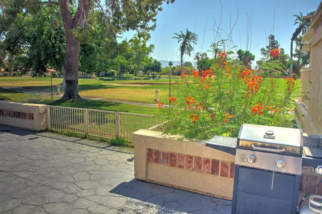 Discover Luxury living in this stunning 2-Bedroom, 2-Bath condo. Almost entirely remodeled with high-end finishes. Some of the upgrades include a new A/C & Heater and all new interior & exterior doors and windows plus a finished garage. Additionally a 4-seater golf cart with new lithium battery. Located in Indian Palms Country Club, on a golf course. GOLF COURSE UNDER NEW MANAGEMENT. This home offers breathtaking views of the green and a serene green belt. The outdoor spaces are equally impressive, featuring front and back patios adorned with stamped concrete, perfect for alfresco dining or lounging under the sun. Inside, enjoy a spacious layout filled with natural light. Every detail has been thoughtfully designed, from the kitchen to the spa-like bathrooms. Indian Palms offers by membership, a Lifestyle Center including a large pool, gym, tennis and pickle ball courts and bocce ball. Embrace the desert lifestyle in this exceptional property. List of upgrades in Documents