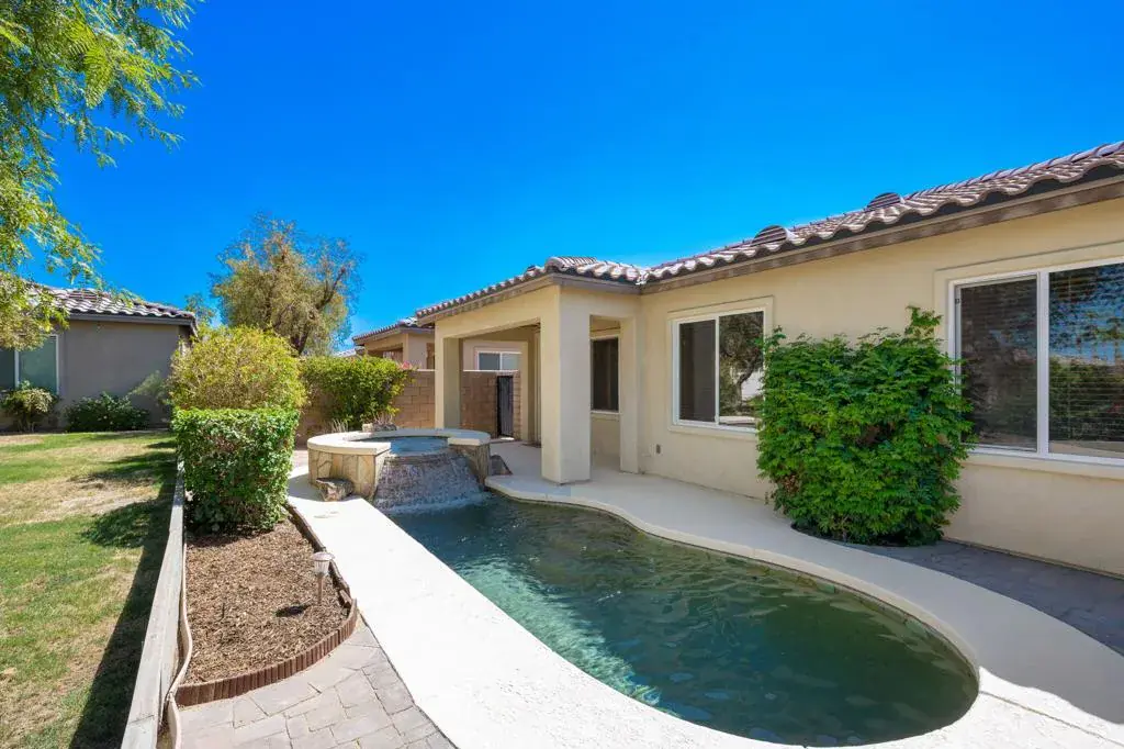 Welcome home to your beautiful lakefront pool oasis. Upon entering the private front courtyard you will find the casita with an en-suite and large closet. The main house features two bedrooms, two bathrooms, large open concept kitchen and dining, tile floors, high ceilings and custom plantation shutters. The oversized family room opens onto the fully landscaped private pool deck! The backyard is nicely situated to provide a full lake view and still maintain complete privacy. Indian Palms is one of the lowest priced HOA’s that include a guard gated entrance, pickleball, tennis, four pools and both front and backyard landscaping. The community also offers full golf membership options, hotel, and relaxed short term rental restrictions which creates a perfect investment opportunity. Currently the city is accepting short term rental applications. Indio is often coined the City of Festivals and Indian Palms is just a block away from the Empire Polo Club where Coachella and Stagecoach are hosted.