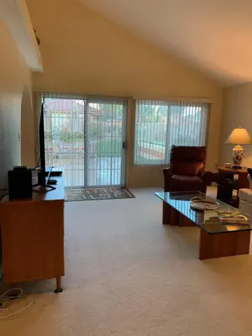 This lovely 3 bedroom, 1.75 bath condo is an end unit. Vaulted ceiling in living room enhances the feeling of spaciousness. Light & bright. Condo is offered TURNKEY FURNISHED. Nicely decorated. There is a slider from the living room out to the west patio. Master bedroom which has vaulted ceiling has slider out to private patio. Kitchen has granite counter tops and Newer appliances. Guest bedrooms are light & bright. Association pool/spa are a short walk…golf, lighted tennis, pro shop, restaurant are nearby. SEASONAL RENT $4,250.00/mo.; AVAILABLE Nov. – $3,500/mo. May thru Oct $2500/mo.HOA PROHIBITS rentals LESS than 30 Days.