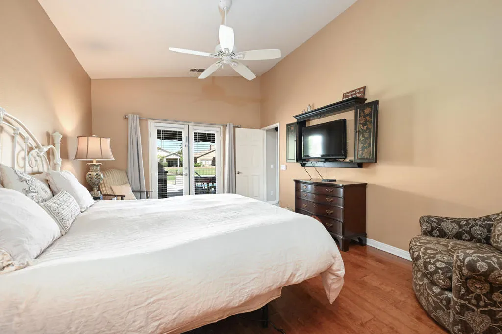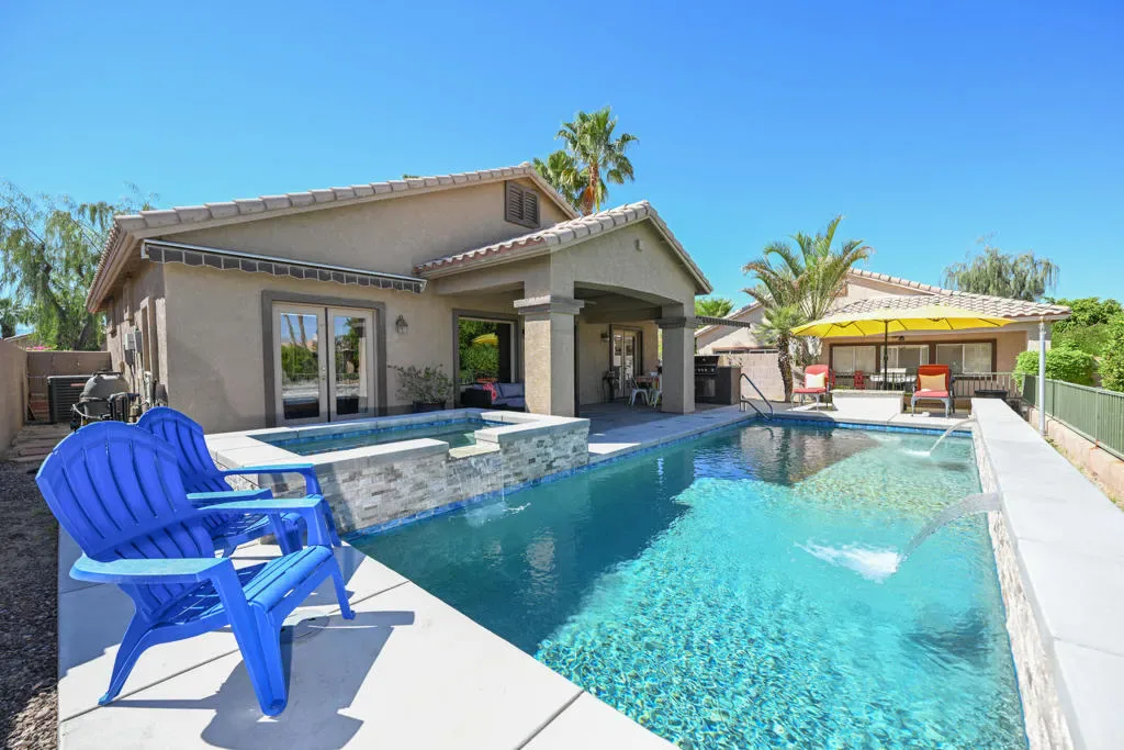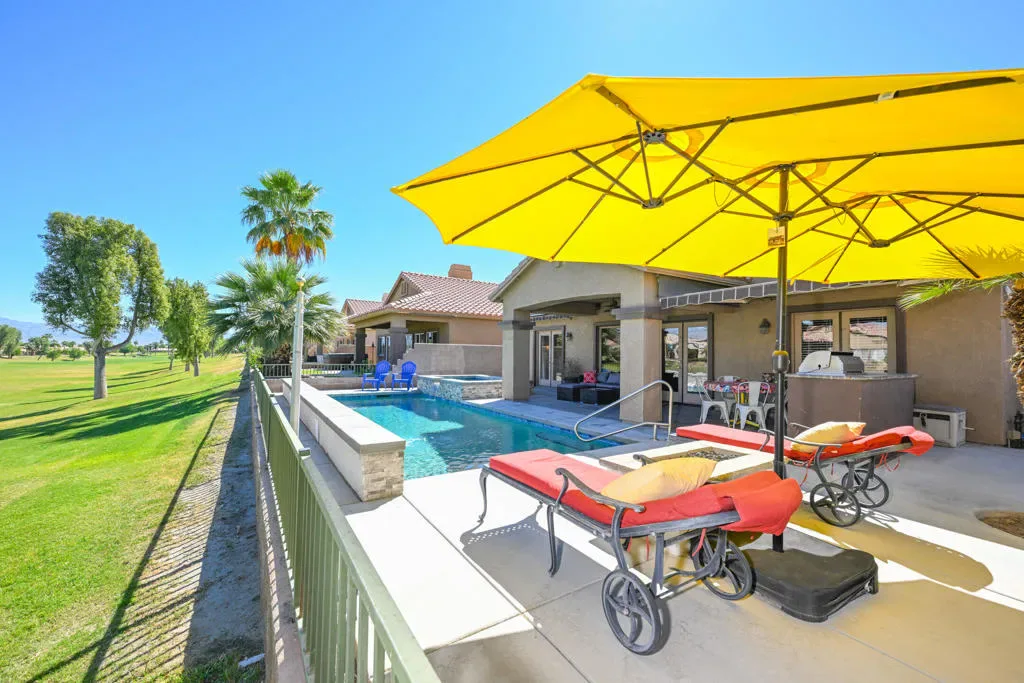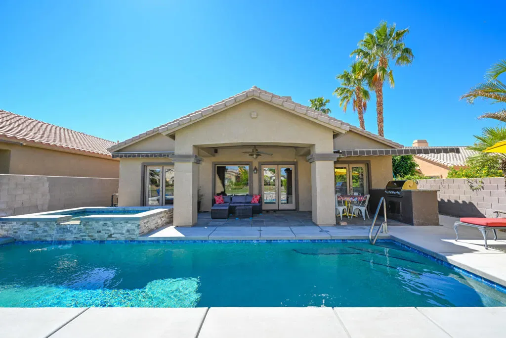 Enjoy the desert life in this beautifully designer-furnished vacation retreat featuring two private primary suites, each with French doors opening to a resort-style backyard with a custom pool and spa.The upgraded kitchen showcases granite countertops, abundant cabinetry and prep space, a sunny breakfast nook, breakfast bar seating, recessed lighting, crown molding, and a convenient pantry located off the laundry room.The open great room is designed for comfortable living and entertaining, offering a spacious dining area, gas fireplace with custom mantel and tile surround, built-in media center with speakers, and French doors that create seamless indoor-outdoor flow. The garage is equally well-appointed with an epoxy floor, built-in workbench, and its own A/C.Step outside to an exceptional outdoor living space perfect for entertaining, complete with a stunning custom pool and spa, covered patio, motorized awnings, fire feature, built-in BBQ, expanded concrete decking, and extensive landscape lighting — all overlooking a picturesque golf course view.Just bring your swim trunks, golf clubs, and sunscreen and start enjoying the desert lifestyle. Rental includes a utility allowance, DirecTV, Wi-Fi internet, and access to two community pools, spas, and fitness centers. Ideally located near La Quinta, Palm Desert, PGA West, and the Indian Wells Tennis Garden.Jan-Feb-Mar $6,000 | April $7,000 | Nov-Dec-May $4,500 | June through October $3,900 | Annual Lease available for $4,200Inquire for more details, deposits and fees. Small dog with approval and additional fee. No cats. Home furnishings, rates, and availability are subject to change.
