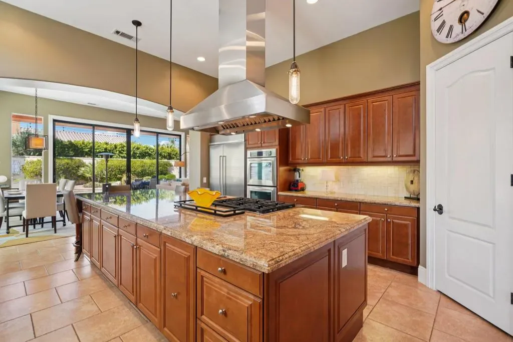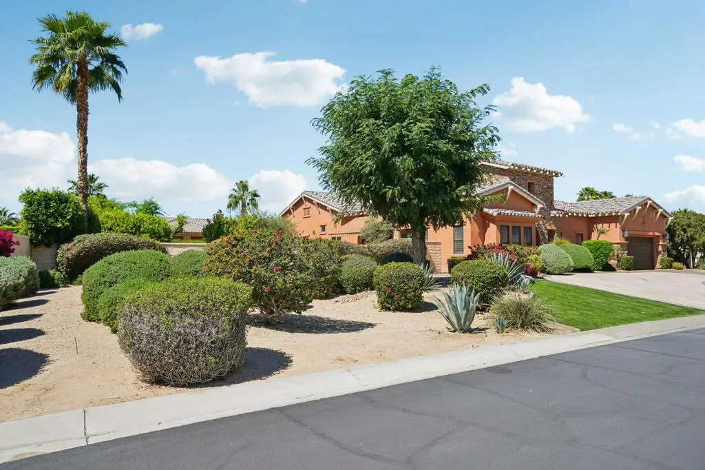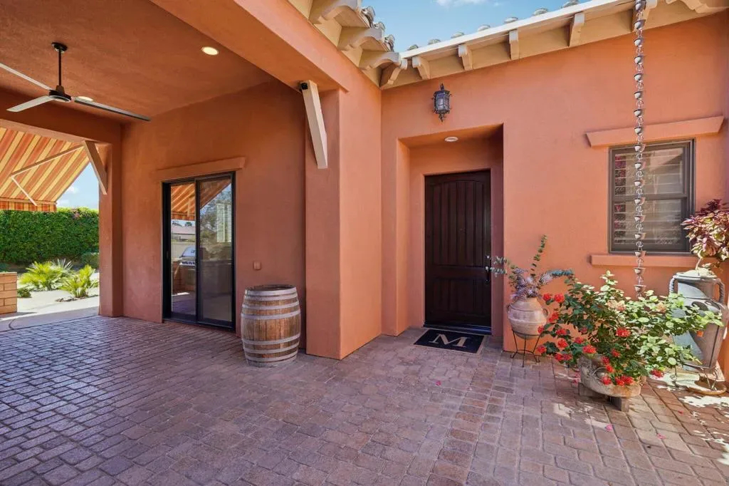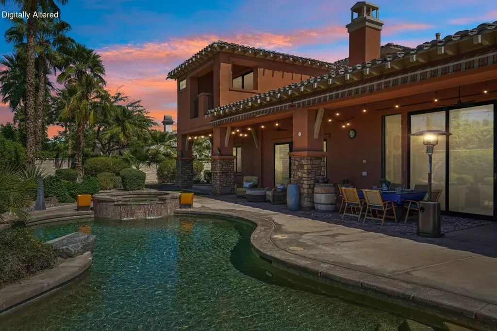 Set behind the gates of Madison Estates, one of the most desirable communities in South Indio, this highly upgraded estate delivers scale, privacy, and true resort-style living on an expansive half-acre lot. Perfectly positioned near world-class golf, premier shopping and dining, the Thermal equestrian venues and polo grounds, and just minutes from Coachella and Stagecoach music festivals, this is desert living at its finest.From the moment you arrive, the circular driveway and stunning iron entry gate create a grand first impression, leading into a private courtyard that sets the tone for what’s inside. Soaring ceilings and a bright, open great room floor plan welcome you with an immediate sense of space and sophistication. Floor-to-ceiling sliding doors frame beautiful views of the estate-sized pool and seamlessly blend indoor and outdoor living.The chef’s kitchen is designed for both entertaining and everyday luxury, featuring professional-grade stainless-steel KitchenAid appliances, a custom-built-in Miele coffee system, and an oversized slab granite island with a custom backsplash. This kitchen commands attention and performs at the highest level. The thoughtfully designed layout offers four spacious bedrooms, each with its own private bath, including a detached casita ideal for guests or multigenerational living. Upstairs, a massive multi-purpose suite with its own private bath and covered observation deck currently serves as a fifth bedroom, but could easily function as a game room, theater, executive office, or private retreat with elevated views.Impressive upgrades continue throughout the home, including 8-foot solid-core doors, oversized base molding, Cat5 wiring, surround sound with ceiling speakers and wall controls, and more. Large side yards enhance privacy, while the beautifully designed pool area becomes the centerpiece for entertaining under the desert sky. Madison Estates offers the security of a gated neighborhood combined with the convenience of being close to everything that makes the Coachella Valley special. This is more than a home–it’s a statement property designed for those who want space, luxury, and lifestyle all in one extraordinary setting.