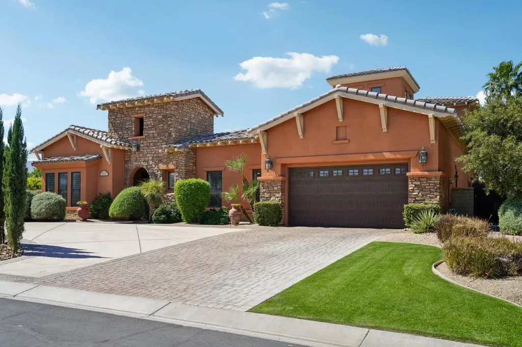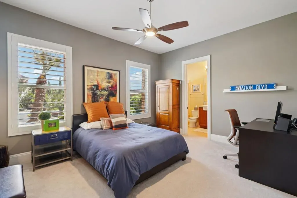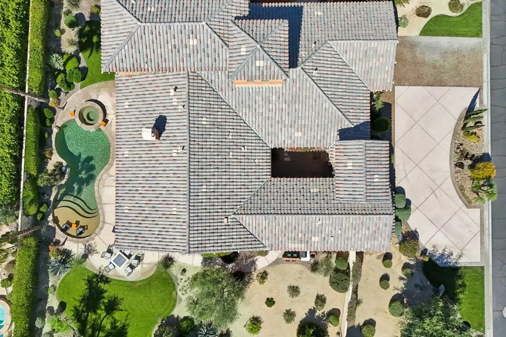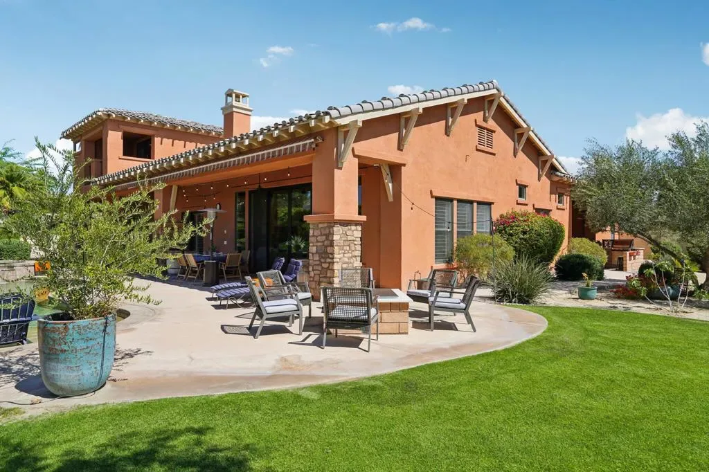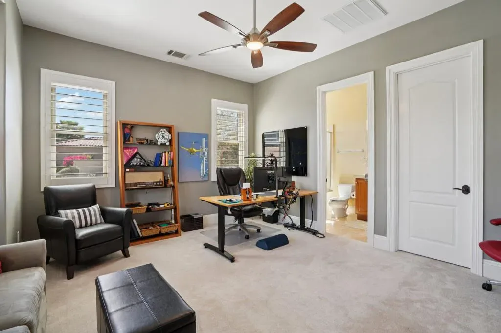 Set behind the gates of Madison Estates, one of the most desirable communities in South Indio, this highly upgraded estate delivers scale, privacy, and true resort-style living on an expansive half-acre lot. Perfectly positioned near world-class golf, premier shopping and dining, the Thermal equestrian venues and polo grounds, and just minutes from Coachella and Stagecoach music festivals, this is desert living at its finest.From the moment you arrive, the circular driveway and stunning iron entry gate create a grand first impression, leading into a private courtyard that sets the tone for what’s inside. Soaring ceilings and a bright, open great room floor plan welcome you with an immediate sense of space and sophistication. Floor-to-ceiling sliding doors frame beautiful views of the estate-sized pool and seamlessly blend indoor and outdoor living.The chef’s kitchen is designed for both entertaining and everyday luxury, featuring professional-grade stainless-steel KitchenAid appliances, a custom-built-in Miele coffee system, and an oversized slab granite island with a custom backsplash. This kitchen commands attention and performs at the highest level. The thoughtfully designed layout offers four spacious bedrooms, each with its own private bath, including a detached casita ideal for guests or multigenerational living. Upstairs, a massive multi-purpose suite with its own private bath and covered observation deck currently serves as a fifth bedroom, but could easily function as a game room, theater, executive office, or private retreat with elevated views.Impressive upgrades continue throughout the home, including 8-foot solid-core doors, oversized base molding, Cat5 wiring, surround sound with ceiling speakers and wall controls, and more. Large side yards enhance privacy, while the beautifully designed pool area becomes the centerpiece for entertaining under the desert sky. Madison Estates offers the security of a gated neighborhood combined with the convenience of being close to everything that makes the Coachella Valley special. This is more than a home–it’s a statement property designed for those who want space, luxury, and lifestyle all in one extraordinary setting.