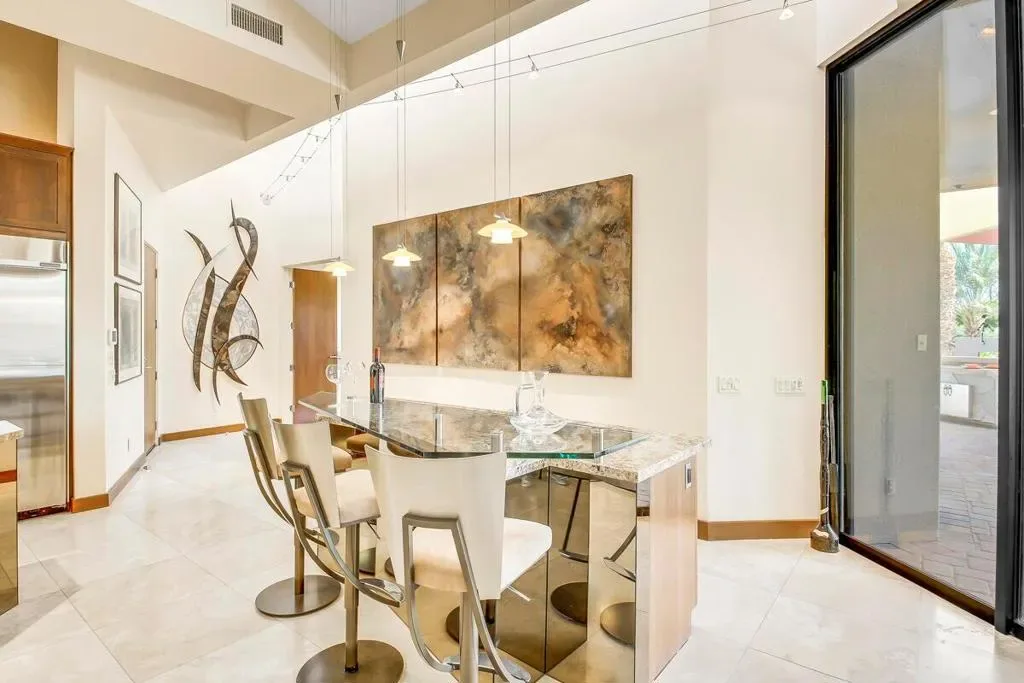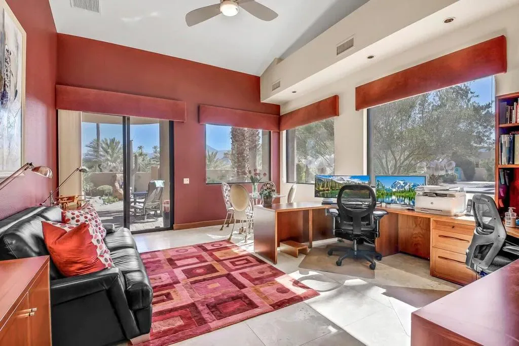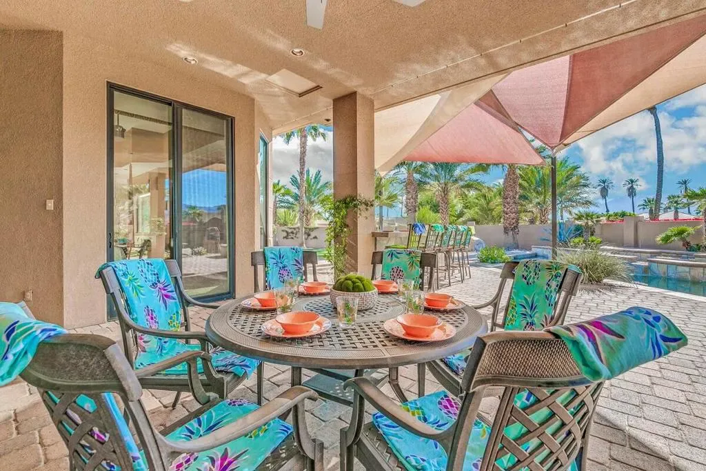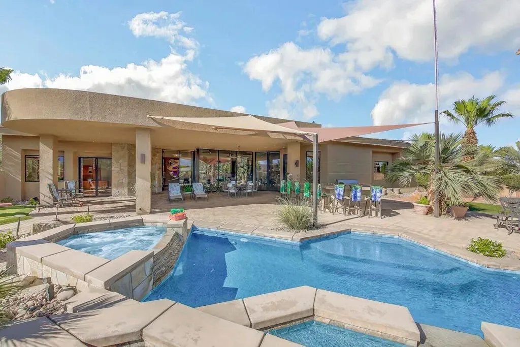 A rare opportunity to own a true desert compound designed for scale, versatility, and lifestyle. Set on 1.3 acres of open space and framed by breathtaking panoramic mountain views, this one-of-a-kind estate delivers unmatched flexibility for collectors, investors, and those seeking privacy without compromise.Bring your motor coaches, exotic cars, and recreational toys, this property was built to accommodate it all. Featuring a 5-car detached garage, a 45-foot bus garage, and an attached oversized garage with a 14-foot roll-up door, there is room for everything and more.Inside, the home showcases elevated design and craftsmanship with polished travertine flooring, an expansive open-concept layout, and walls of glass capturing awe-inspiring desert views. The chef’s kitchen is both functional and striking, offering stainless steel appliances, granite countertops, a beverage center, and a massive walk-in pantry.All three bedrooms are private en-suites, including a luxurious primary retreat complete with a soaking tub, oversized walk-in shower, and a space designed for true relaxation.Step outside to your own private resort–featuring a saltwater pool, luxury spa with waterfall, and endless views that create a sense of total escape.Adding to the property’s value and uniqueness, the estate includes 145 Medjool date trees. There is also ample space to build an ADU or expand into a multi-structure compound. The detached garage offers potential for conversion into a guest casita or additional living space.Offered furnished per inventory list, this property is not just a home it’s a rare investment in lifestyle, income potential, and long-term value.