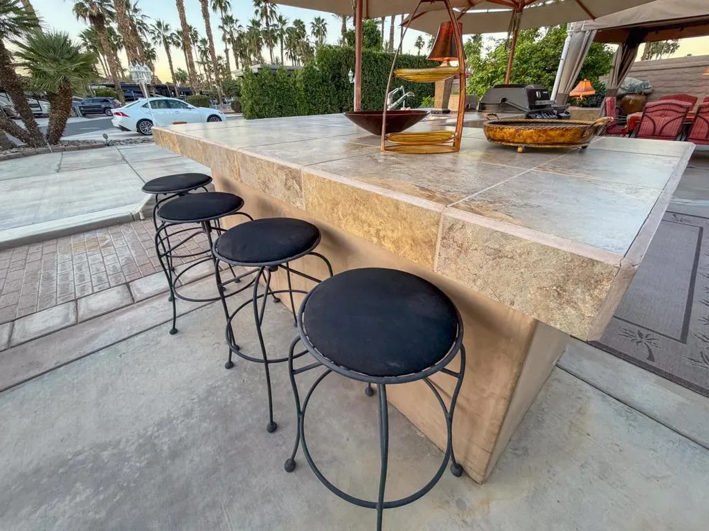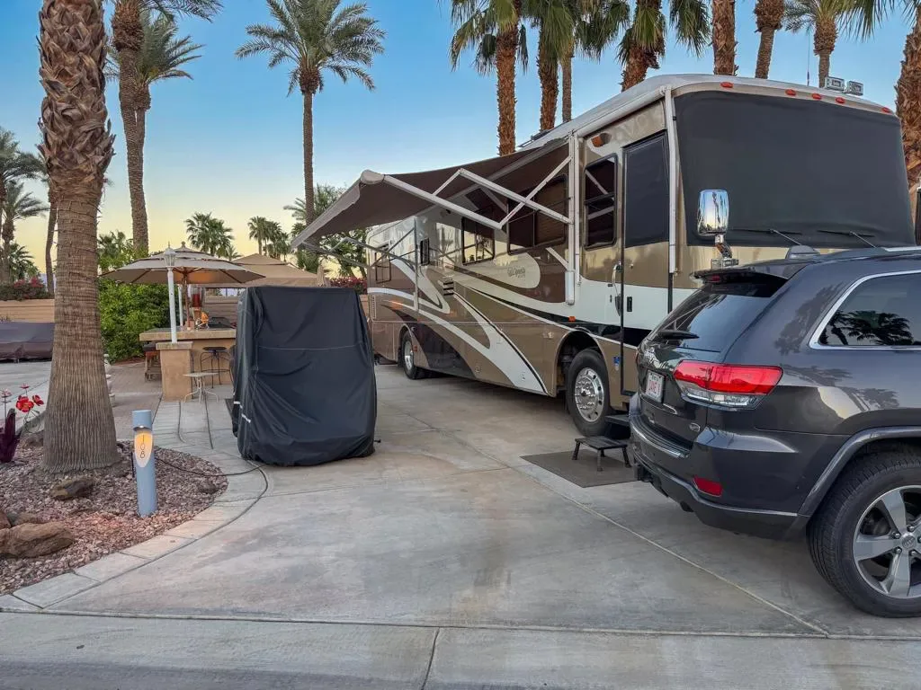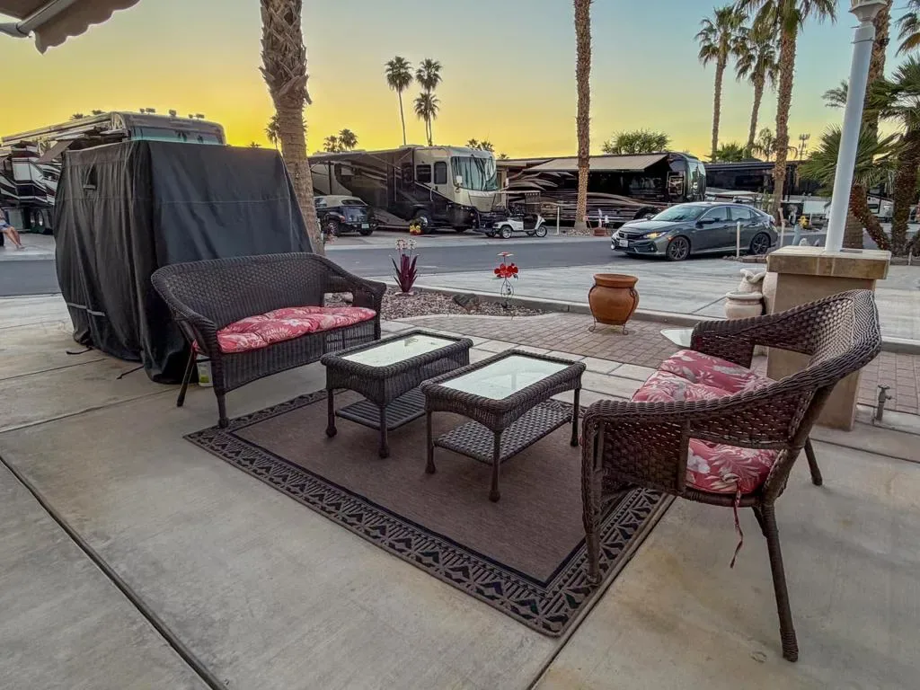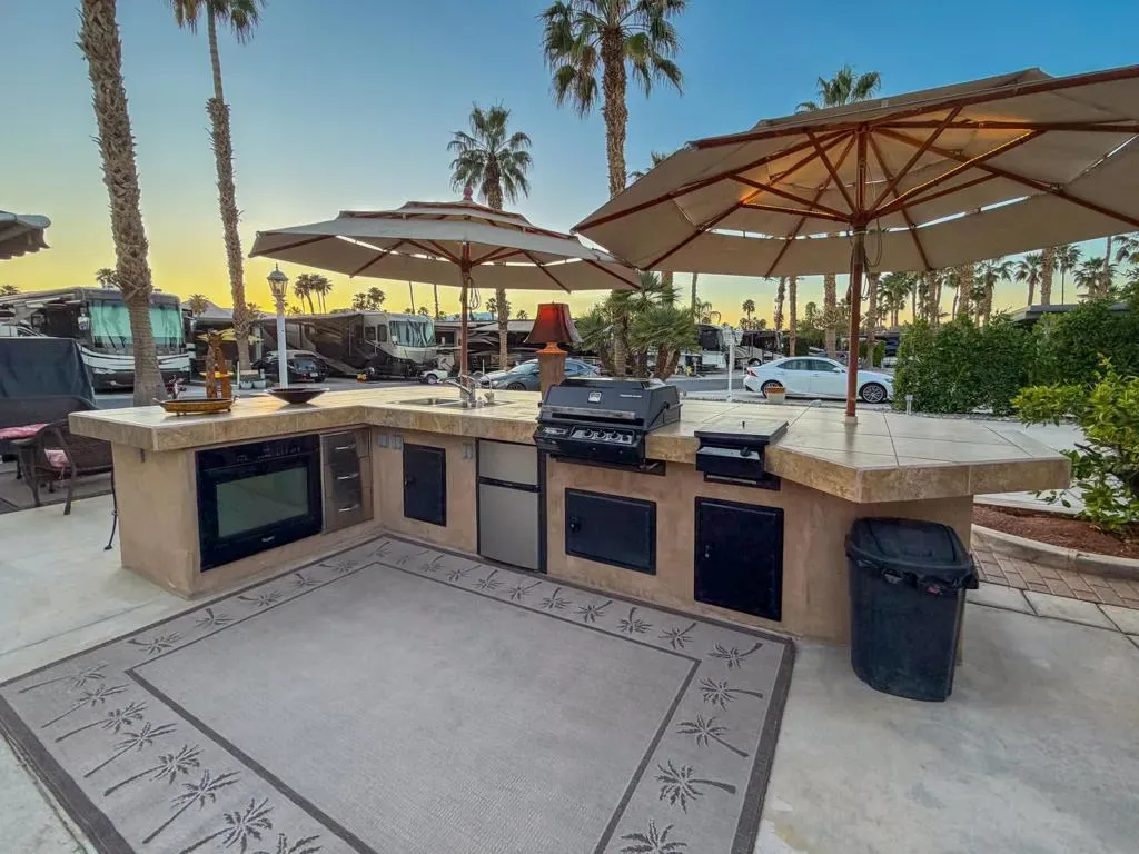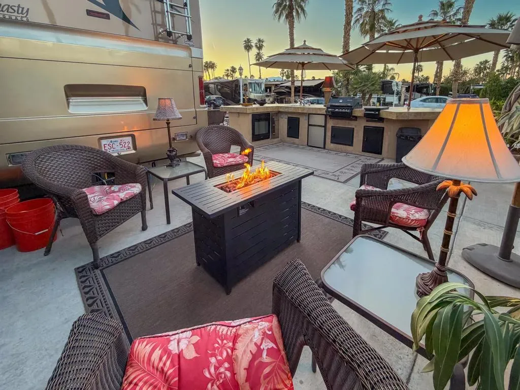 Welcome to another exceptional opportunity at Outdoor Resort Indio, one of the premier Class A motorcoach resorts in the Coachella Valley. Designed with entertaining and comfort in mind, this lot centers around a gazebo with shades and a newer top, creating a comfortable outdoor living space throughout the desert season.The medium-sized outdoor kitchen is thoughtfully equipped with an electric stove, refrigerator, built-in BBQ, two-burner cooktop, garbage disposal, and hot water sink, along with two additional freestanding bar refrigerators — ideal for hosting gatherings. Seating is abundant and inviting, including a dining table with six red-cushioned chairs, a fire table surrounded by four wicker chairs, two wicker loveseats with matching coffee tables, round and square bar stools, and additional glass end tables to complete the entertaining setup.Practical features include a water softener, a large storage shed, two plastic storage bins, and even a golf cart with cover included for easy access around the resort. Located just a short walk to a satellite pool with hot tub and sauna, this lot offers the perfect blend of relaxation, convenience, and vibrant resort living at Outdoor Resort Indio.Outdoor Resort Indio is a Class A only RV resort
