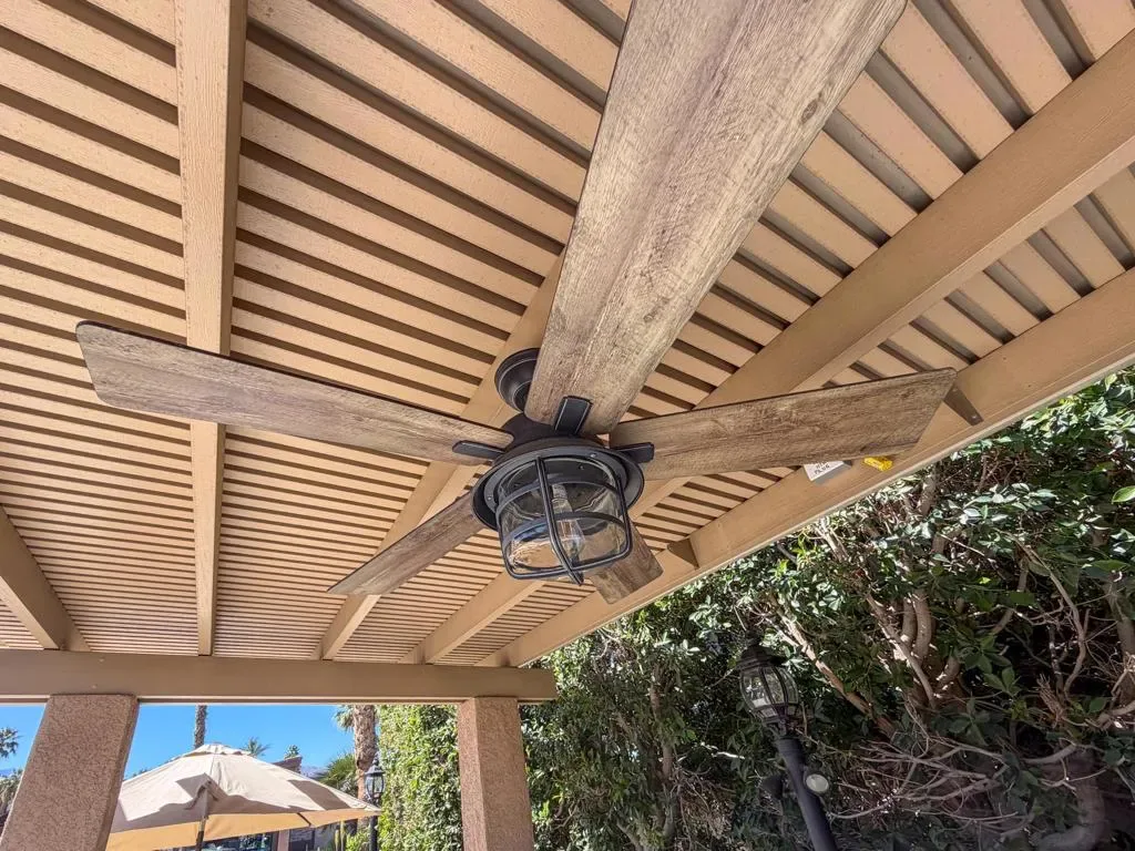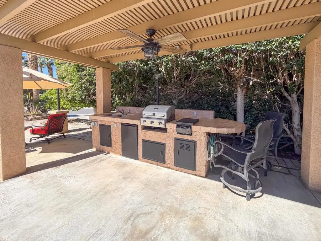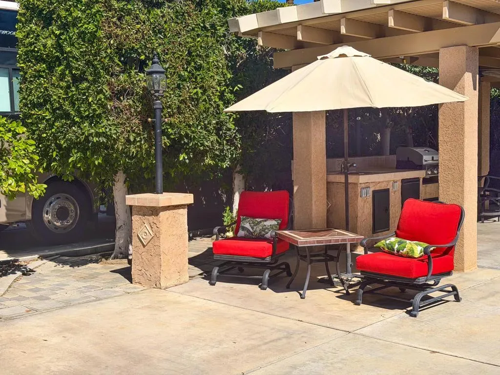 Welcome to Lot 110 at Outdoor Resort Indio, a cozy and private RV lot ideally located close to the clubhouse while still offering a peaceful retreat.The L-shaped Alumawood pergola features a solid roof, three heaters with dual controls and heating elements, and two ceiling fans, creating a comfortable outdoor living space throughout the desert season. A built-in entertainment center with TV enhances the outdoor experience, making it perfect for relaxing or hosting friends.The medium-sized kitchen is well-equipped with a cooktop, new BBQ, under-counter refrigerator, garbage disposal, and hot water, providing everything needed for outdoor cooking and entertaining. The lot also includes a round dining table with four chairs, a front seating area with table, umbrella, and two chairs, plus additional outdoor furniture surrounding a welcoming fire pit with six semi-circle chairs.Landscaping and pavers extend into the back of the lot, where you’ll also find a private pet area and two storage boxes for added convenience.Lot 110 offers a wonderful blend of comfort, privacy, and proximity — just a short stroll to the clubhouse while maintaining your own quiet space to enjoy the resort lifestyle. Outdoor Resort Indio is a class A only motorcoach resort.