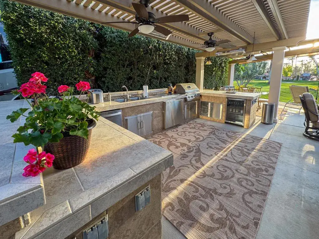 Enjoy breathtaking western sunset views over the golf course from this private and entertainment-ready luxury RV lot. Designed for both hosting and relaxation, it features a beautiful pergola and a spacious outdoor kitchen with stainless steel appliances, a built-in BBQ, a four-burner cooktop, oven, two refrigerators, and a year-old dishwasher. Thoughtfully shaded with no direct sun on the coach window, this lot stays cool while offering ample seating, a fire table, and extra storage.Under the pergola, three ceiling fans provide a cooling breeze, while four heaters, a movable heater, and two mushroom heaters ensure warmth on cooler nights. Hand-crank sun shades and ambient lighting create a cozy atmosphere, perfect for evening gatherings. Pavers extend across the back, offering parking for a car and golf cart, all within a quiet location just a short walk from the pool, hot tub, sauna, and clubhouse. This comfortable lot is the perfect blend of luxury, privacy, and resort-style living.Outdoor Resort Indio is a class A only RV resort in Indio, CA.