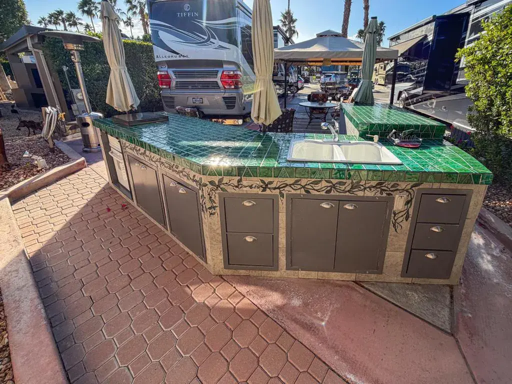 This luxury RV lot at Outdoor Resort Indio offers a unique blend of style, comfort, and resort convenience, designed for relaxed outdoor living and easy entertaining. A gazebo-style sun shelter and extended paver surfaces enhance the width and usability of the lot, creating multiple inviting spaces to enjoy the desert lifestyle.The medium-sized outdoor kitchen is thoughtfully arranged toward the rear of the lot for added privacy and shade, featuring a sink with hot water, cooktop, oven, refrigerator, and generous storage. Eye-catching custom paint embellishments add character and charm, while recently updated water fixtures ensure modern functionality. The lot comes furnished and includes a golf cart, making it truly move-in ready.Three umbrellas provide additional shade over the kitchen and seating areas, and the spacious rear of the lot offers a peaceful, private retreat ideal for relaxing or hosting friends. Located within walking distance to a satellite pool, hot tub, and laundry facilities, this RV lot combines thoughtful upgrades with a prime location–perfect for enjoying all that Outdoor Resort Indio has to offer.Outdoor Resort Indio is a Class A only RV resort