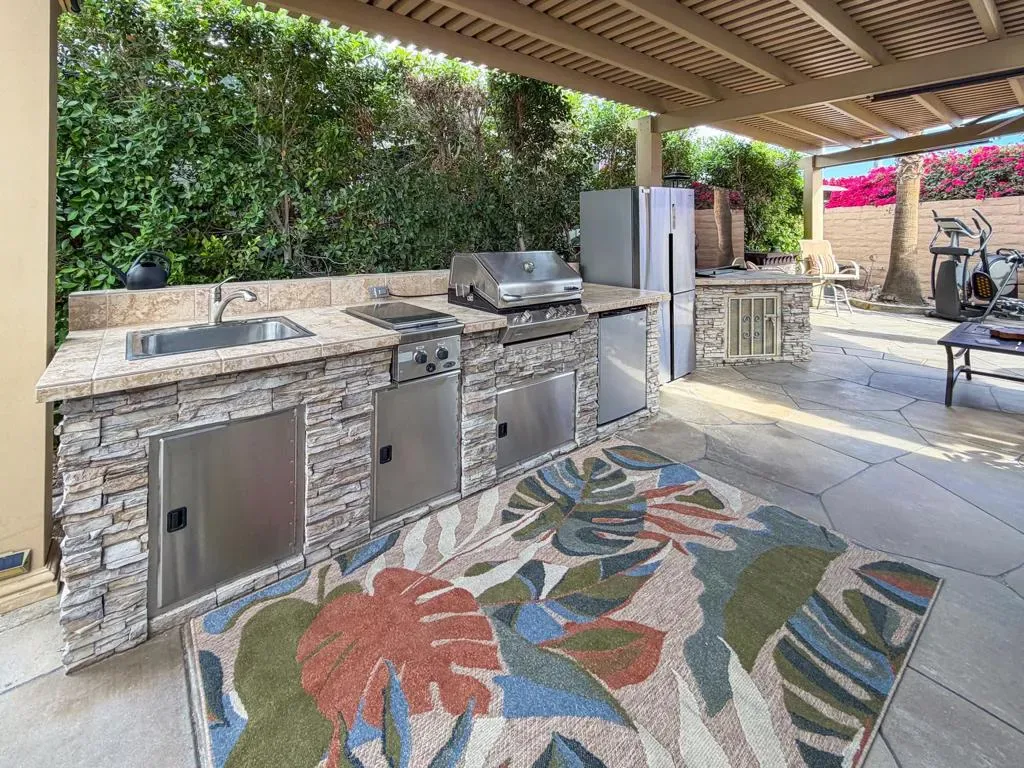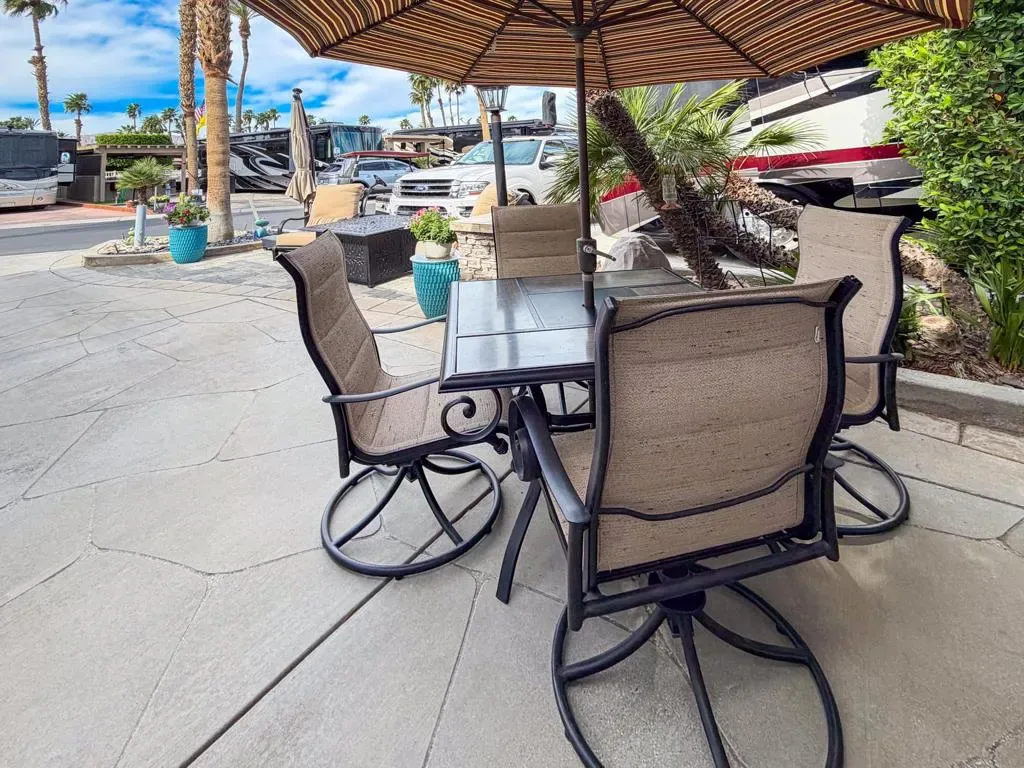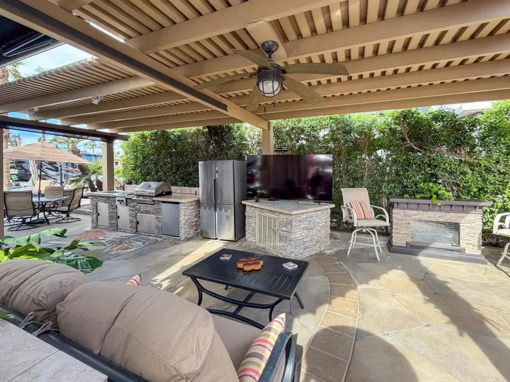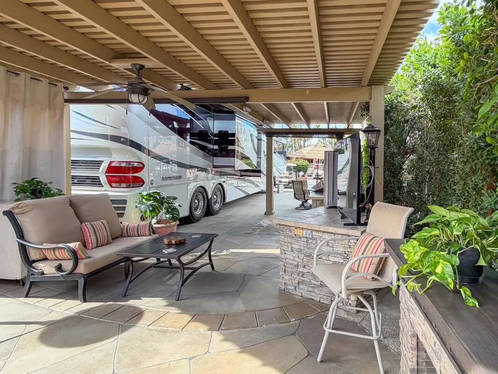 This inviting space centers around an L-shaped pergola with ceiling fan, creating a comfortable outdoor living area. Manual drop-down shades provide excellent shade control, added privacy, and the ability to capture warmth when desired. The coated RV pad and pavers that widen the parking area enhance both appearance and functionality.The medium-sized outdoor kitchen features a natural rock surface, stainless appliances, sink, gas two-burner cooktop, built-in BBQ, under-counter refrigerator, abundant storage, and a full-size freestanding refrigerator — offering everything you need for easy entertaining. A built-in storage and counter area that matches the kitchen provides the perfect setup for a TV or outdoor entertainment space.Furnishings include a square dining table with umbrella and four swivel chairs, an additional square table with two cushioned swivel chairs, two more swivel chairs, a loveseat with coffee table, and a freestanding fireplace for cozy evenings. Two pieces of exercise equipment are also included.Walking distance to a satellite pool and laundry facilities, Lot 74 offers comfort, convenience, and a peaceful setting within the resort — a wonderful opportunity to enjoy the season in your own private retreat.Outdoor Resort Indio is a class A only motorcoach resort.
