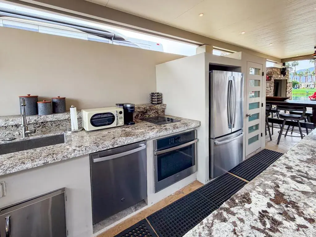 This upgraded pergola RV lot at Outdoor Resort Indio offers a desirable southern exposure with sweeping mountain, lake, and golf course views in a very private setting. The long pergola features a large granite outdoor kitchen with island, five-seat built-in bar, stainless sink with hot water and disposal, oven, dishwasher, and abundant storage–ideal for entertaining.Enjoy wrap-around electric screens, three ceiling heaters, and two ceiling fans for added comfort. A privacy wall with full-size refrigerator and pantry adds function, while a built-in entertainment center with fireplace anchors the living area. The coated RV pad and a separate matching BBQ kitchen with under-counter fridge complete the setup.Additional highlights include a dining table with six chairs, fire table with seating, chaise loungers, large umbrella, and a spacious rear relaxation area. South-facing with the coach windshield to the north, this lot is a short walk to the clubhouse and offers tranquil fountain sounds and expansive views for refined resort living.Outdoor Resort Indio is a Class A RV only resort.