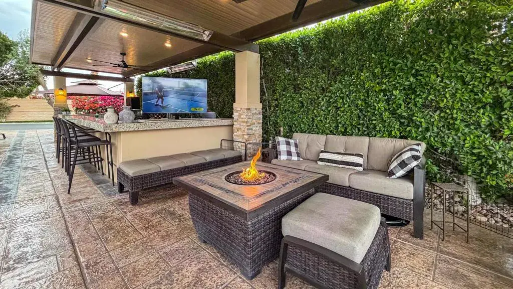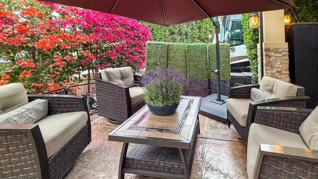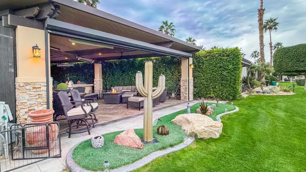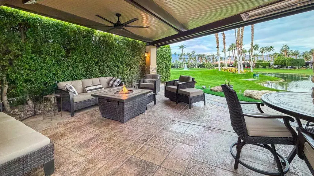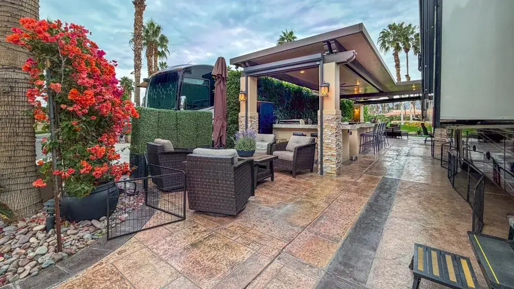 Outdoor Resort Indio is a Class A Motorcoach resort. This is an RV lot. Lot #239 at Outdoor Resort Indio is a thoughtfully designed RV resort lot offering privacy, golf course, lake, and mountain views, along with inviting outdoor living. A five-year-old, well-anchored roof covers a beautiful L-shaped Alumawood pergola with stacked stone pillars, enhanced by abundant recessed lighting and a generous front covered area–perfect for storing chairs and cushions during the rare desert rain.The outdoor kitchen includes granite countertops with a wrap-around bar, all-stainless appliances, a built-in Blaze BBQ and refrigerator, oven, dishwasher, hot water, garbage disposal, and ample storage. A TV on a Televator swivels for ideal viewing, while three electric screens, two ceiling fans, and three ceiling heaters provide year-round comfort.The stamped and sealed concrete RV pad and kitchen area create a clean, finished look. Enjoy golf course, lake, fountain, and bridge views with stunning sunsets, all without walk-by golfers or motorcoaches across the street. A private front seating area with bougainvillea hedges–maintained by the HOA–offers a peaceful spot for morning coffee. Partially furnished and pet-friendly, with a dog area directly across the lot, this is a quiet, private setting ideal for relaxed resort living.