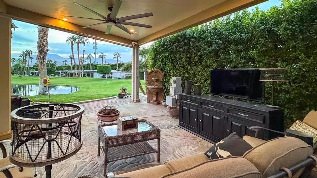 This rare and highly sought-after lot on ‘The Hill’ offers an elevated vantage point with breathtaking panoramic views of majestic mountains, serene ponds, cascading waterfalls, elegant fountains, and illuminated bridge, all set against the backdrop of a picturesque sunset. Designed for the discerning Class-A motorcoach owner, this lot blends luxury, privacy, and functionality, creating the perfect desert retreat. The insulated roof pergola, enhanced with exterior sconce lighting, provides a comfortable and stylish outdoor living space, while the southern exposure maximizes natural light without overwhelming heat.Enjoy outdoor entertaining with a small kitchen featuring a sink, hot water, and fridge, along with extended pavers, beautifully integrated landscaping, and a privacy wall for added seclusion. The electric and manual screens provide comfort, letting you adjust for sun, shade, or a gentle breeze. The carved concrete RV pad, adorned with an intricate artwork medallion, adds a touch of elegance, while the attached storage cabinet and extra deck boxes provide ample space for your essentials. Mid-lot hookups ensure effortless connectivity, and with room to relax, entertain, and take in the unparalleled scenery. Don’t miss out on this exclusive opportunity.Outdoor Resort Indio is a Class Only RV resort.
