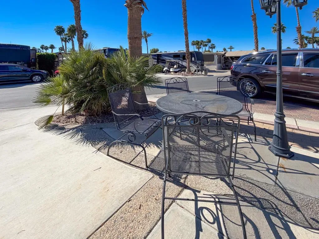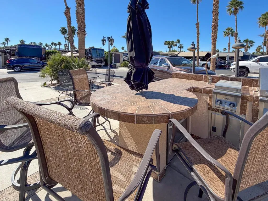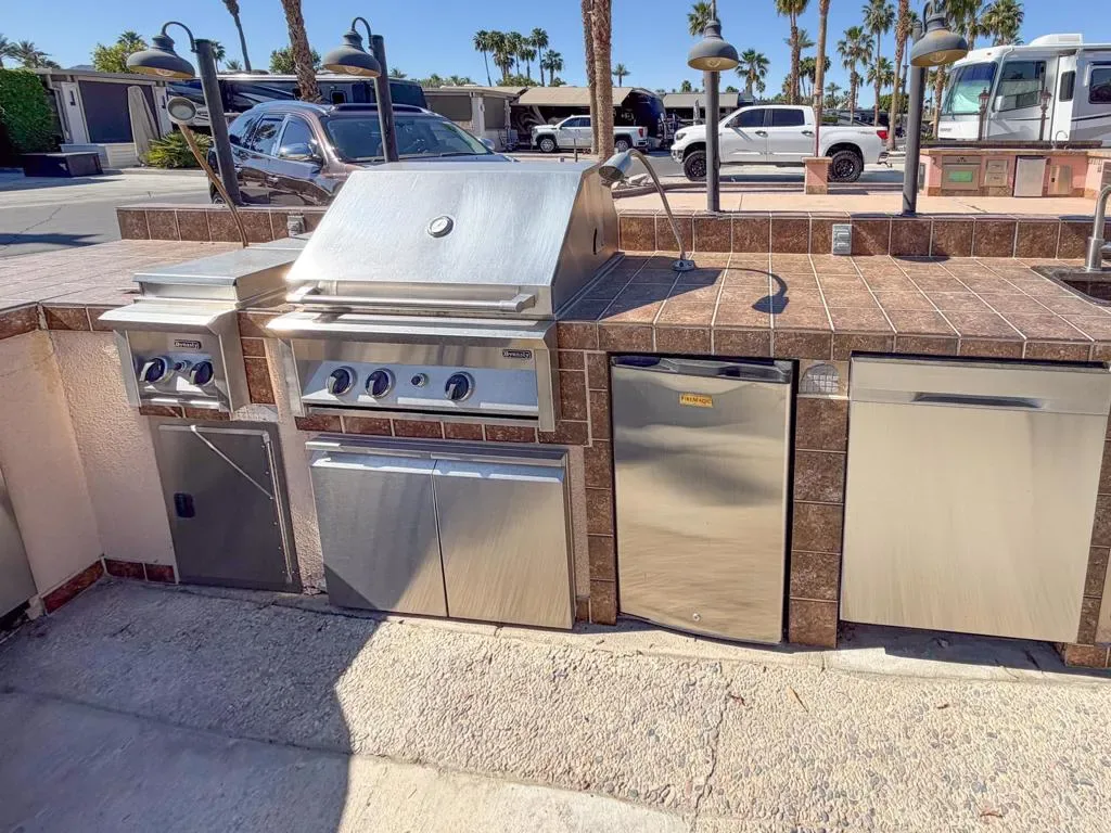 Outdoor Resort Indio is a class A only RV resort and this is an RV lot.Enjoy privacy, comfort, and resort convenience with this beautifully landscaped lot located just a short walk from the satellite pool, hot tub, sauna, and laundry. The inviting medium-sized outdoor kitchen features a round bar with umbrella and four chairs, built-in gas burner and large BBQ, oven, dishwasher, refrigerator, sink, and storage, all enhanced by ample lighting and hot water for effortless entertaining.Multiple seating areas include a dining table with umbrella, an outdoor fire table flanked by two sofas, and additional chairs and side tables–perfect for gathering with friends. This is a private and well-designed lot offering a true resort lifestyle.