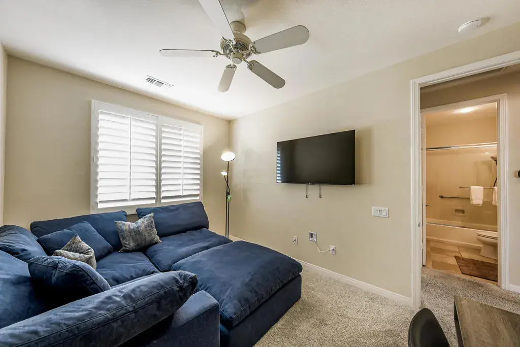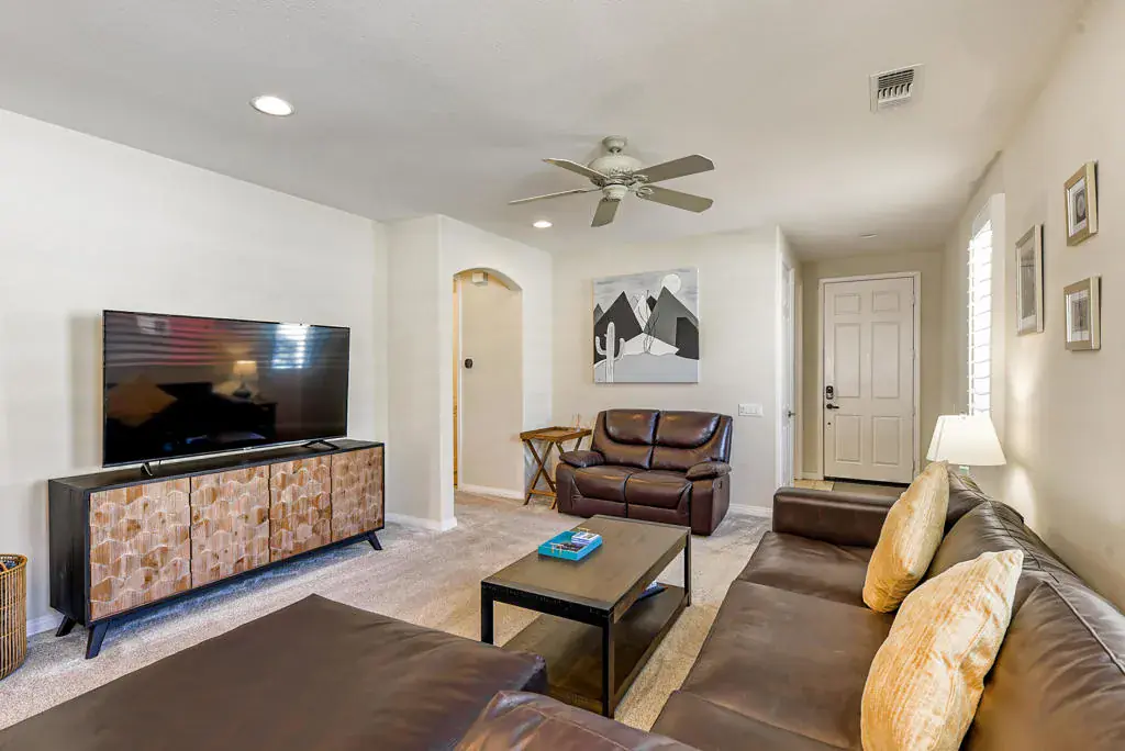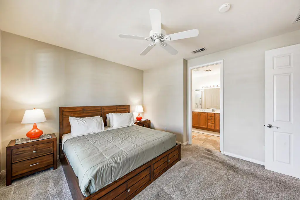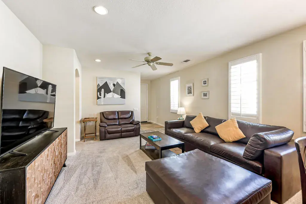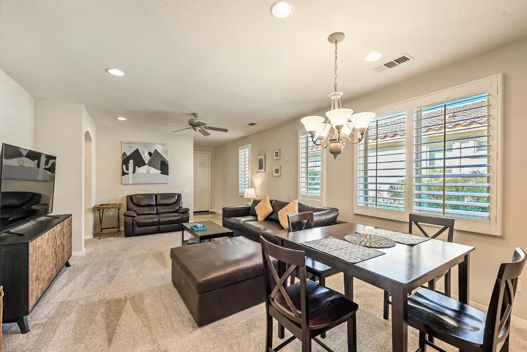 Available now for summer months! This fastidiously maintained San Olivia floor plan was built to 1,374 SF (EST.) in 2005. Everything is just right here because you not only have 2 bedrooms and 2 baths, but also a den, which will have a desk added to it to make it a true home office! There are ceiling fans, recessed lighting & upscale light fixtures on high ceilings, and beautiful plantation shutters on all windows. The kitchen has high quality 42 inch cabinets, granite countertops, and a stool height bar overlooking the dining area and great room. There is a spacious master suite that has dual vanities, a glass enclosed shower, walk-in closet, and slider to the patio. The guest bedroom, guest full bath, and den are located across the home from the master bedroom for maximum privacy. There is a two car attached garage with lots of room for storage and an easy access man-door that leads to the side yard. The rear covered patio runs the full width of the home. Plenty of space here for desert outdoor enjoyment. They have easy-care desert landscaping throughout. Short walks to the dog parks and the Main Clubhouse, which offers an indoor lap pool, an outdoor resort style swimming pool and spa, a fitness center, billiard tables, and so much more. Summer rate available. Seasonal Rental.